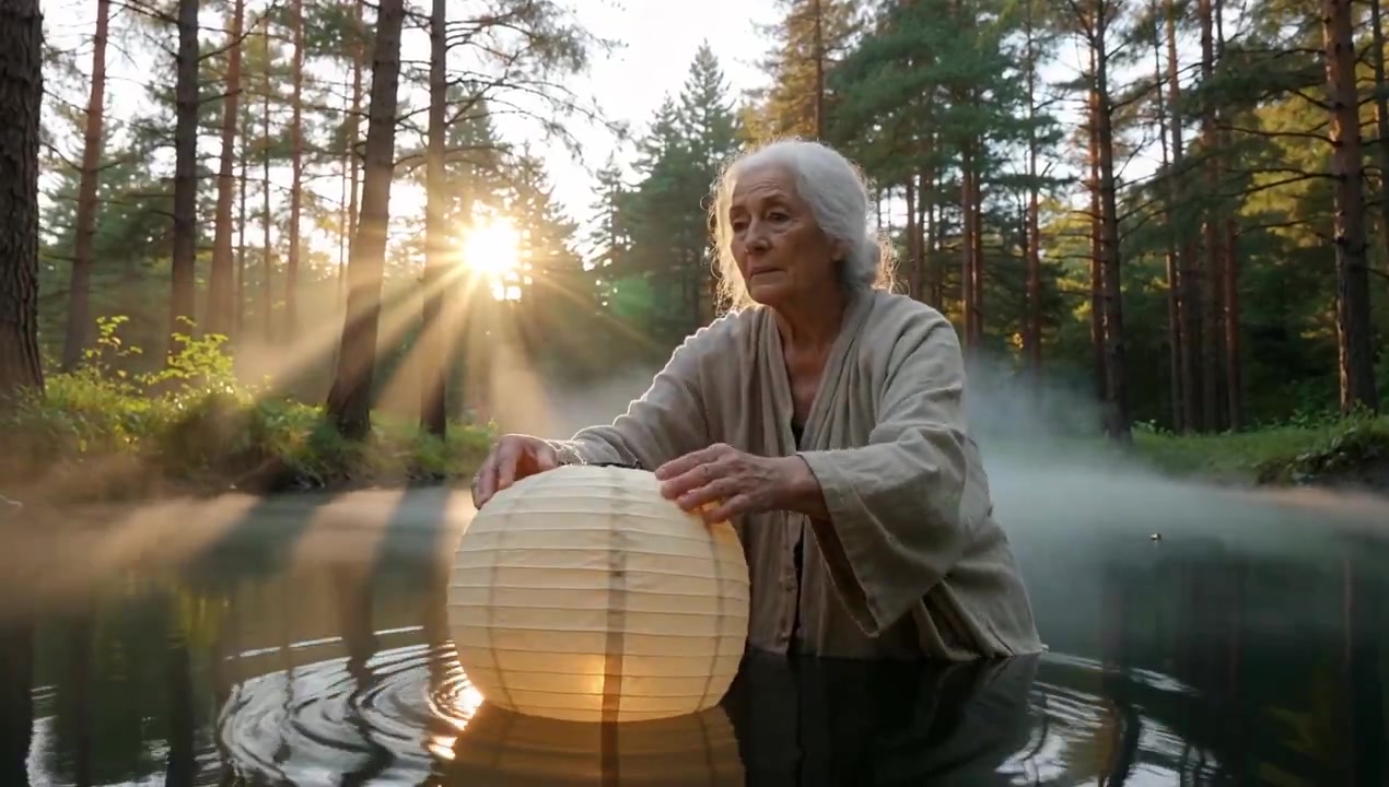 A silver-haired elderly woman in a loose linen dress stands at the edge of a misty forest lake at dawn, her weathered hands releasing a paper lantern onto the still water; the camera uses a slow lens push from medium close-up to close-up, capturing her peaceful yet mournful expression; soft side light from the early morning sun filters through the fog, casting a warm glow and rim light around her silhouette; the scene is composed with central framing and uses a telephoto lens to compress the depth of the misty forest; stylized with a poetic, melancholic tone