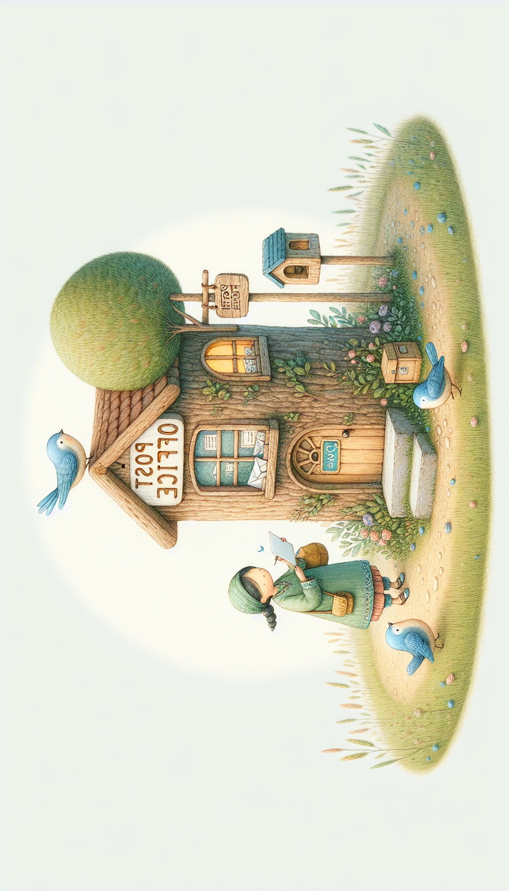 A small post office shaped like a tree stump stands at the edge of a meadow. Tiny windows glow warmly, and a painted sign swings above the door. A hedgehog in a little satchel sorts letters while bluebirds perch nearby, waiting to deliver them. Rendered in soft storybook illustration style with pastel colors and gentle detail.