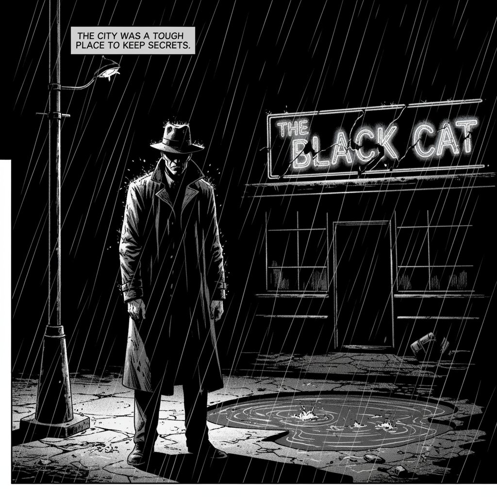 A single comic book panel in a [art style] style. In the foreground, [character description and action]. In the background, [setting details]. The panel has a [dialogue/caption box] with the text "[Text]". The lighting creates a [mood] mood. [Aspect ratio].