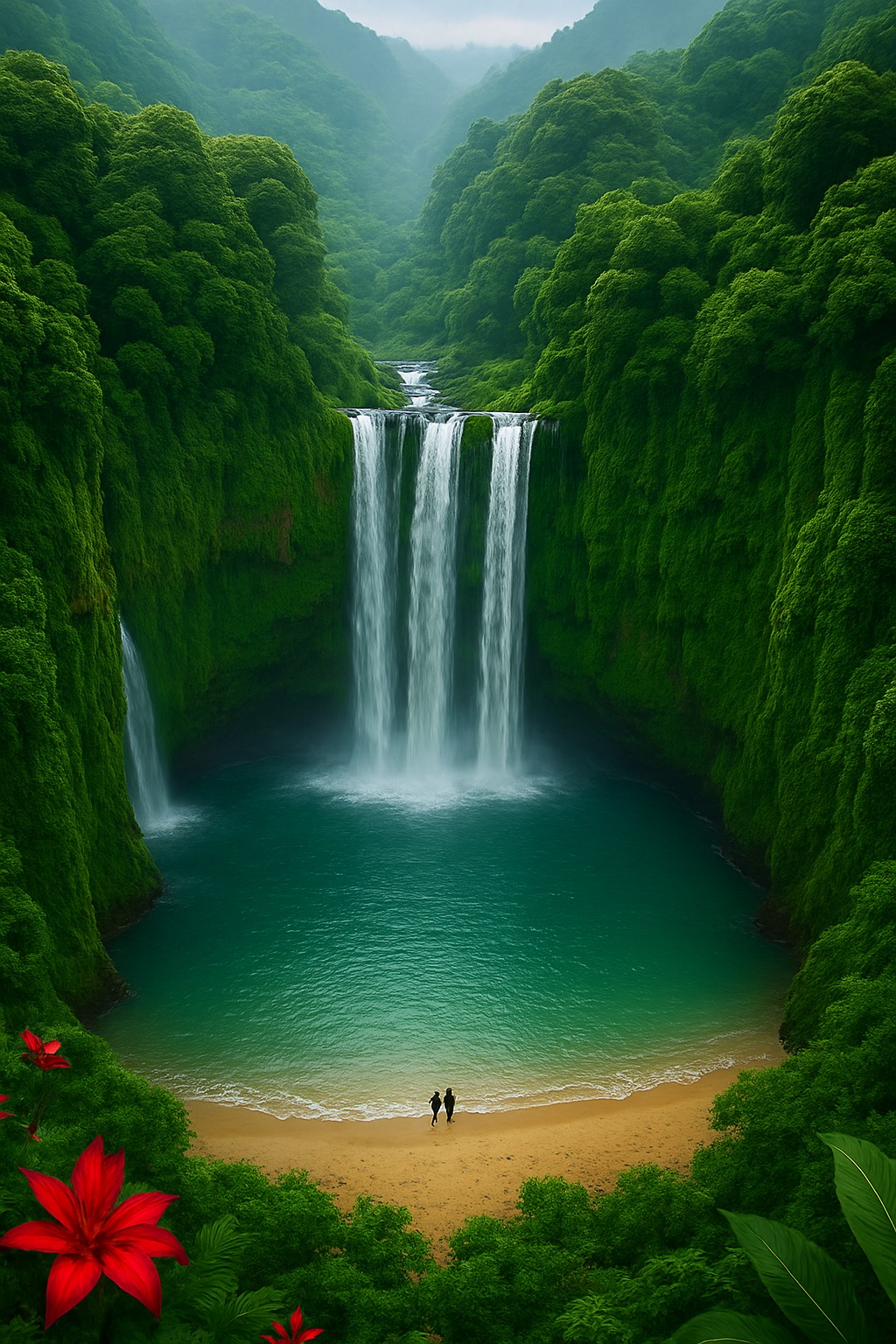 "A breathtaking, ultra-realistic fantasy landscape of a majestic multi-tiered waterfall cascading into a turquoise lagoon surrounded by steep, moss-covered cliffs. The lush, dense rainforest stretches into misty mountains in the background, creating a mystical and serene atmosphere. The waterfall splits into multiple streams, falling powerfully into the emerald pool below. At the base of the lagoon lies a golden sandy shore, where two tiny human figures stand in awe, emphasizing the grand scale of nature. Vibrant tropical flowers with bright red petals frame the foreground, adding vivid contrast to the deep greens and blues. The entire scene exudes tranquility, wonder, and natural grandeur, captured in stunning detail. 9:16 Ratio with 16K"