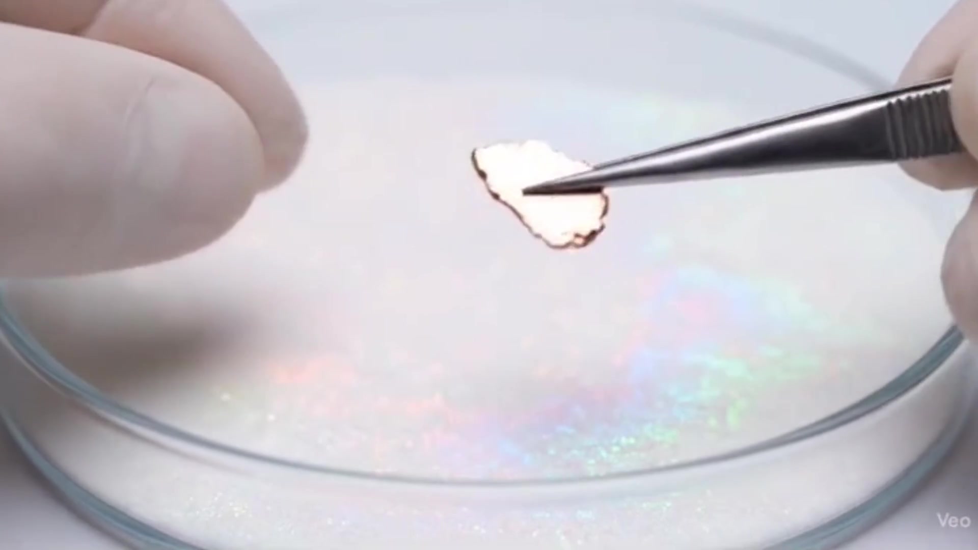 "action": "A gloved hand holds a silver tweezer with a 'flat copper ore flake' in it and carefully puts it into a round petri dish filled with 'crystal powder shining with a colorful halo'",