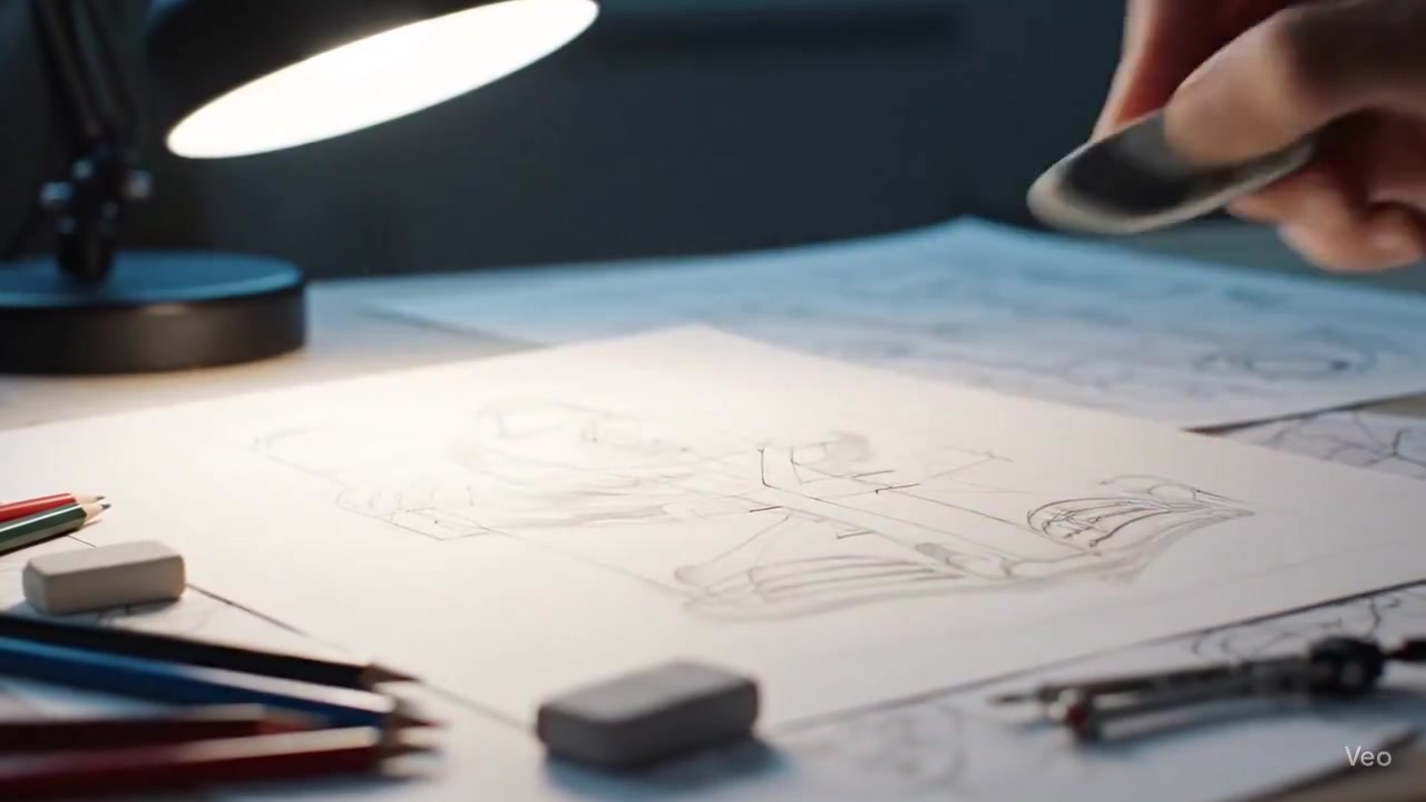"A hyper-realistic sequence showing a photorealistic Formula 1 car emerging from a detailed pencil sketch on a cluttered architect's desk.", "camera": { "type": "Slow Arc Shot", "lens": "100mm Macro Prime", "aperture": "f/2.8", "position": "Starts as an extreme close-up on the pencil drawing, then slowly pulls back and arcs around the car as it transitions to a 3D object.", "environment": { "location": "A designer's or engineer's drafting table.", "details": "The surface is a sheet of high-quality, slightly textured white paper covered in technical blueprints and schematics of the car. Several graphite and colored pencils, an eraser, and a compass are scattered around the main drawing. The background is a dark, out-of-focus workshop." }, "lighting": { "primary_source": { "type": "Architect's Desk Lamp", "position": "Just out of frame, to the top left.", "fill_light": { "type": "Soft Ambient Light", "source": "From the out-of-focus workshop background.", "color": "Cool, bluish tint.", "intensity": "Low, to gently lift the darkest shadows and add depth to the scene." } }, "main_subject": { "name": "The Formula 1 Car", "initial_state": "A masterful, hyper-realistic pencil drawing. The lines are precise, the shading is smooth, and there's a sense of depth even in 2D.", "final_state": "A fully realized, photorealistic 3D model of the Red Bull F1 car. The materials are perfect: glossy carbon fiber, metallic paint with livery, and soft-sheen rubber tires.", "animation": { "0.0s - 2.0s": "The camera is focused on the drawing. A photorealistic hand enters the frame with an eraser and gently removes a few faint construction lines from the sketch.", "2.0s - 7.0s": "A magical 'wave' of transformation begins at the front wing of the car and sweeps backward. As it passes, the 2D pencil lines and shading seamlessly transform into 3D, textured materials. The drawn debris on the track lifts up and becomes real, floating for a moment before settling.", "7.0s - 8.0s": "The transformation is complete. The car is now fully 3D, sitting on the paper as if it's a real, miniature vehicle. The engine subtly whirs to life, and the exhaust vents emit a tiny, realistic heat haze." } }, "audio_design": { "style": "Transformative, from quiet and organic to powerful and cinematic.", "timeline": [ { "time": "0.0s - 2.0s", "sound": "The soft, realistic sound of a pencil's graphite scratching on paper, and the gentle 'shhh' of an eraser." }, { "time": "2.0s - 7.0s", "sound": "A low, magical humming and shimmering sound that grows in intensity and pitch as the transformation wave moves across the car. This is layered with an epic, swelling orchestral score." }, { "time": "7.0s - 8.0s", "sound": "The orchestral score reaches a crescendo. A final, satisfying 'click' as the transformation completes, followed by the low, powerful hum and subtle electronic whir of the F1 car's idling engine." } ] },