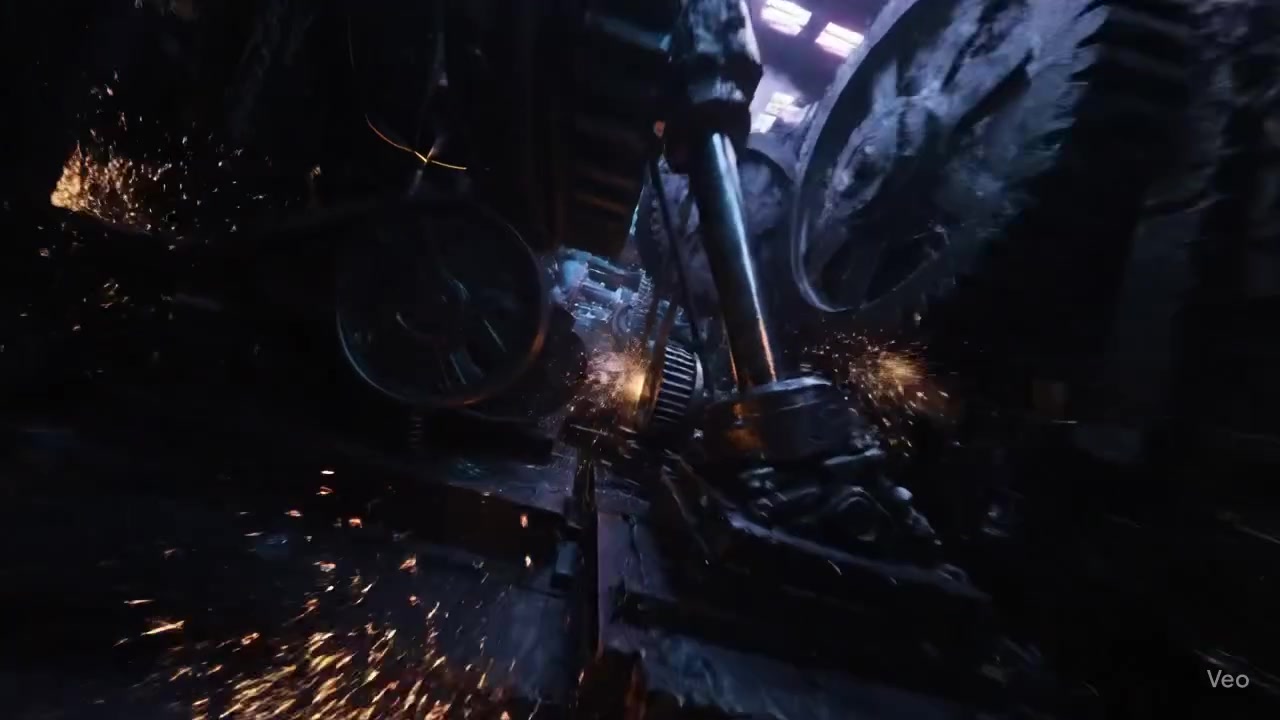 Soundtrack: deep industrial rumble, heavy metallic gear grinding, rhythmic clanks, bursts of steam, electric sparks crackling. Surround sound, immersive, echoing inside a massive metallic chamber.