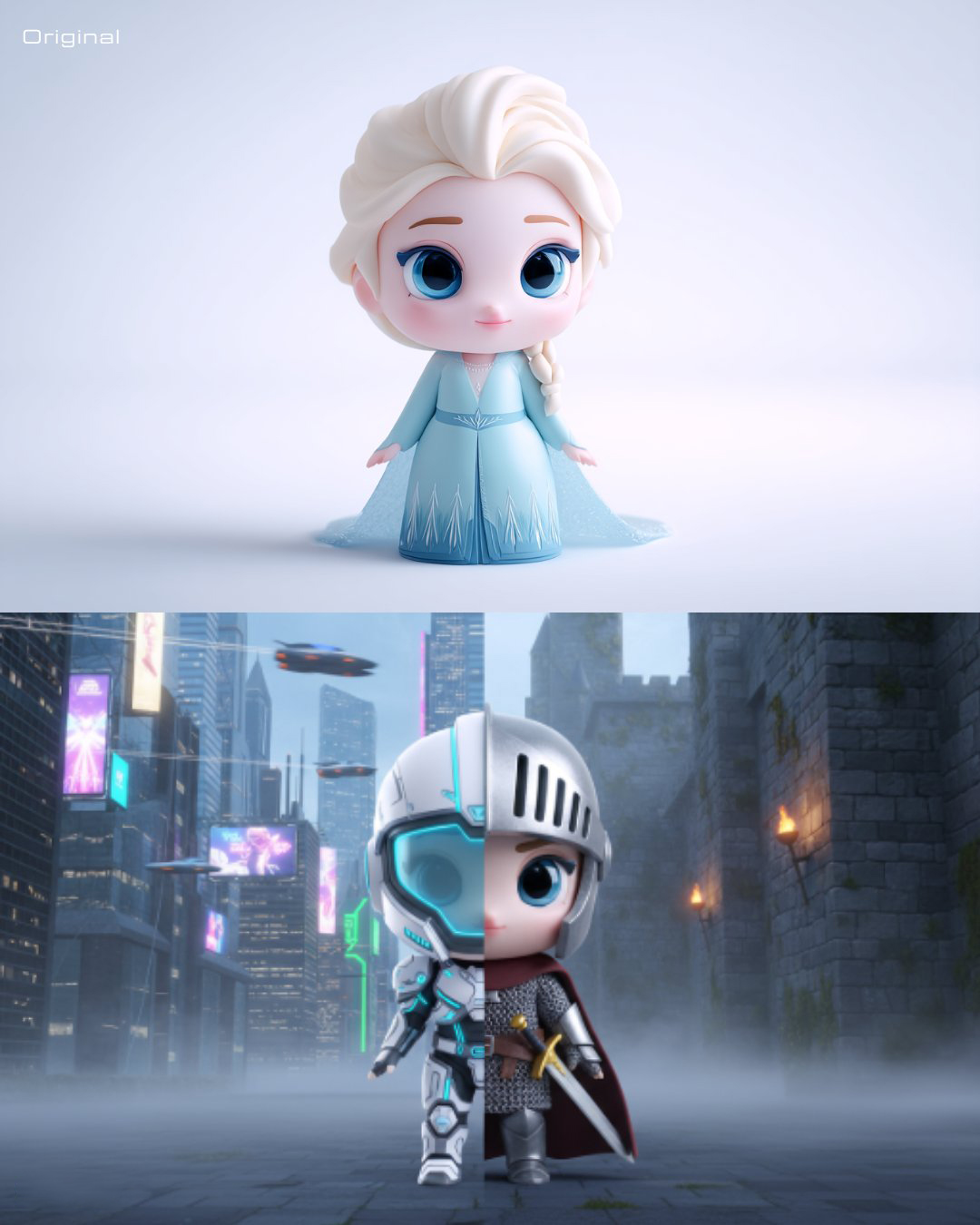 Transform the left half of this character into a futuristic soldier wearing sleek armor with glowing blue tech accents, standing against a high-tech neon-lit cityscape with holographic advertisements and flying vehicles. Transform the right half into a medieval knight clad in detailed chainmail and a sword at his side, set against a foggy castle courtyard with stone walls and torches flickering. Keep the lighting, shadows, and pose consistent across both halves for seamless integration.