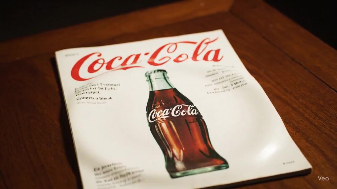 A close-up on the glossy pages of a vintage Coca-Cola magazine ad, laid out on a wooden coffee table. The camera focuses on the bold red logo and a beautifully illustrated glass bottle of Coca-Cola on the page. In an Extractive Revelation, the printed image begins to ripple. The bottle illustration lifts off the paper, expanding into a full-sized, hyper-real glass bottle. Condensation beads form on its surface, fizz crackles inside, and the cap pops with a burst of sound. The bottle fully materializes, landing upright on the table with ice-cold refreshment, the Coca-Cola logo gleaming in the cinematic light.