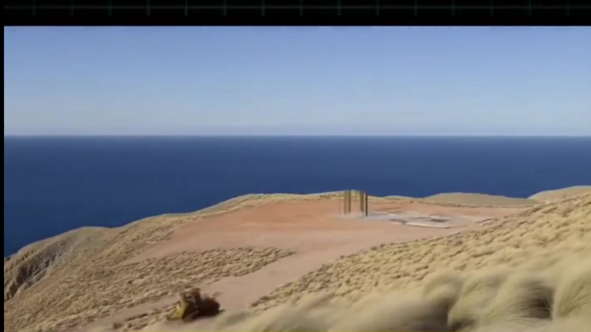 "Timelapse video from a fixed camera overlooking an empty cliffside and vast ocean, wind sweeping through tall grass in the foreground. Bulldozers gradually arrive and carve a plateau, the ground reshaping steadily as they leave frame. Concrete slabs pour in sequence, hardening into place, while steel beams rise methodically upward. Glass walls slowly slot into the structure, shimmering in the changing light. An infinity pool forms, its water glistening and merging with the sea beyond. Terraces gradually bloom with sparse desert plants, filling the barren rock with deliberate touches of life. By sunset, the villa glows with warm interior light, its glass dissolving into the horizon, as if it had always belonged to the landscape."
