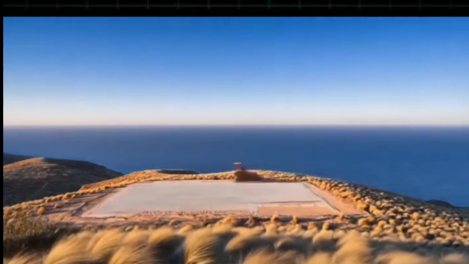 "Time-lapse video of an empty cliffside overlooking the ocean, wind sweeping tall grass.
