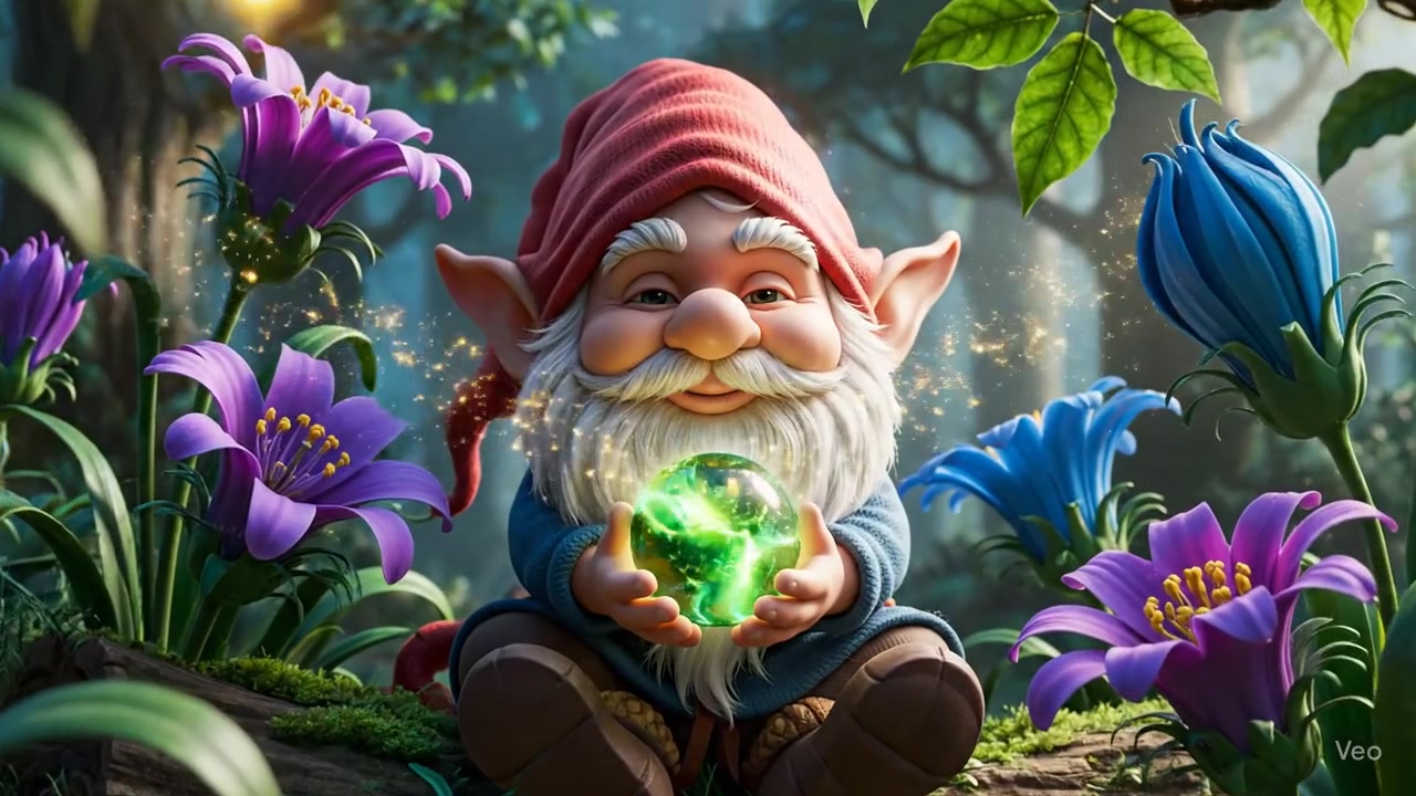 “A magical gnome sitting in the enchanted forest holds a glowing green sphere that pulsates with energy and light. The camera does a gentle zoom-in showing her tender smile and the sphere illuminating her face. Around her, flowers slowly open, magical glitters float in the air, and leaves sway in an enchanted wind. Epic fantasy style, cinematic lighting, ultra detailed, 3D digital realism, 16:9.