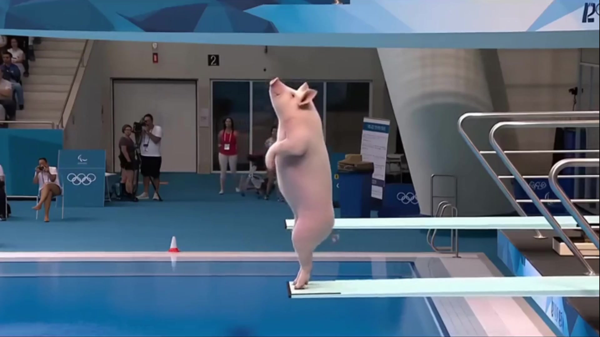 A photorealistic, hyperrealistic 8K video, captured in the style of a dramatic Olympic sports broadcast. The scene is a massive indoor natatorium with a cheering crowd. The camera focuses on the very top of a 10-meter high dive platform, where a large, athletic domestic pig is standing upright on its hind legs. The pig, looking like a focused professional diver, stares down at the pool below. It then performs several short, powerful preparatory bounces on the edge of the concrete platform, gathering its strength and momentum. With a final, explosive push, it launches itself high and outwards, away from the platform. The video switches to slow-motion as the pig travels a significant distance through the air in a majestic, high arc. It executes a complex acrobatic maneuver, perhaps a double somersault with a twist. The camera follows its entire flight path, emphasizing the pig’s hang-time and the surreal sight of a pig flying gracefully. Finally, it straightens its body and cuts cleanly into the blue water with a perfect, minimal splash entry. The overall tone is epic, humorous, and jaw-dropping surreal, with a seamless integration of CGI into a realistic live-action environment.