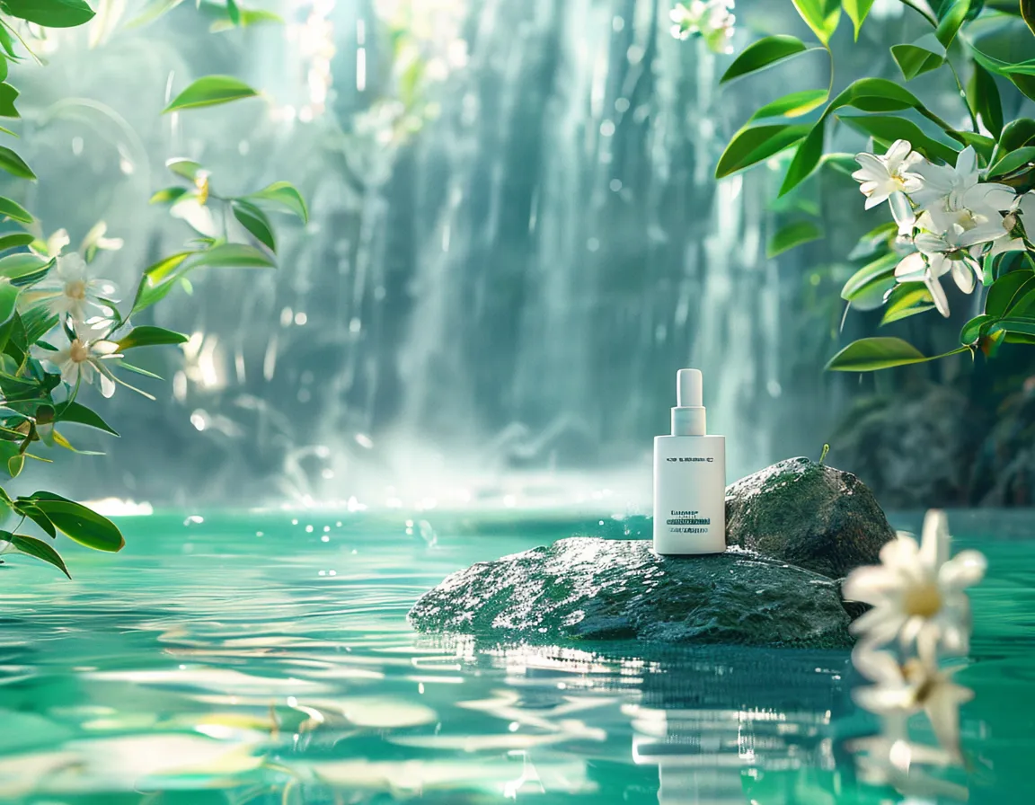 A luxurious skincare product bottle standing elegantly on a smooth rock in the middle of a serene turquoise water pool, with a majestic waterfall cascading in the background. The scene is bathed in natural sunlight, creating a soft, dreamy atmosphere with a misty spray from the waterfall. Vibrant green foliage and delicate white flowers frame the composition on the left, adding a touch of freshness and purity. The bottle is white with minimalist branding, reflecting simplicity and sophistication. The water surface shows a clear reflection of the bottle, enhancing the calm,