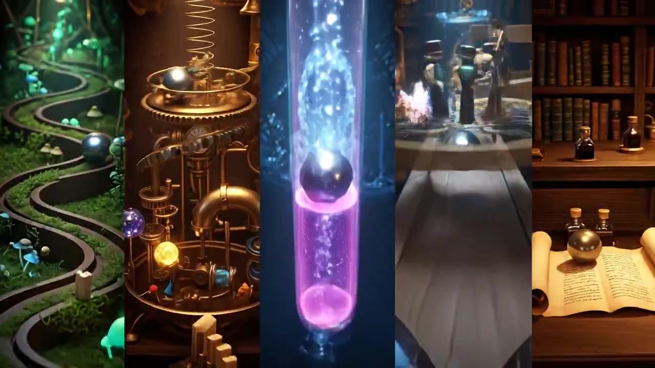 ```A split-screen composition of five vertical panels, all shown simultaneously for the full sequence. Each panel is a continuous close tracking shot, as if a camera is fixed just behind a polished metal ball while it travels through a fantastical Rube Goldberg maze. Each panel shows its own ball on its own roller-coaster-like path of ramps, spirals, loops, and levers. The motion lasts from start to finish, with each ball completing its journey in that panel. All five panels remain active together. Panel 1: a glowing forest maze of mossy ramps and mushroom platforms, ending as the ball rides into a luminous tree hollow. Panel 2: a brass clockwork maze of gears, pendulums, and pipes, ending as the ball spins into a rotating gear cup. Panel 3: a crystalline maze of sparkling arches and mirrored ramps, ending as the ball drops into a radiant crystal bowl. Panel 4: a mechanical garden maze with butterfly wings and flower levers, ending as the ball lands on a glowing pedestal. Panel 5: a scholarly maze built of books, parchment ramps, and ink-bottle levers, ending as the ball rolls into a golden chalice. Camera: very close POV tracking directly behind each ball, smooth continuous motion, eye-level with the track, cinematic realism. Style: imaginative, hyper-realistic fantasy, unified color grading, magical realism. ```