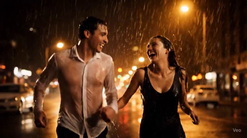 "An 8-second, hyper-realistic, and romantic sequence capturing a couple's spontaneous and joyful run through a city downpour at night, filmed with intimate, dynamic camera movement.",