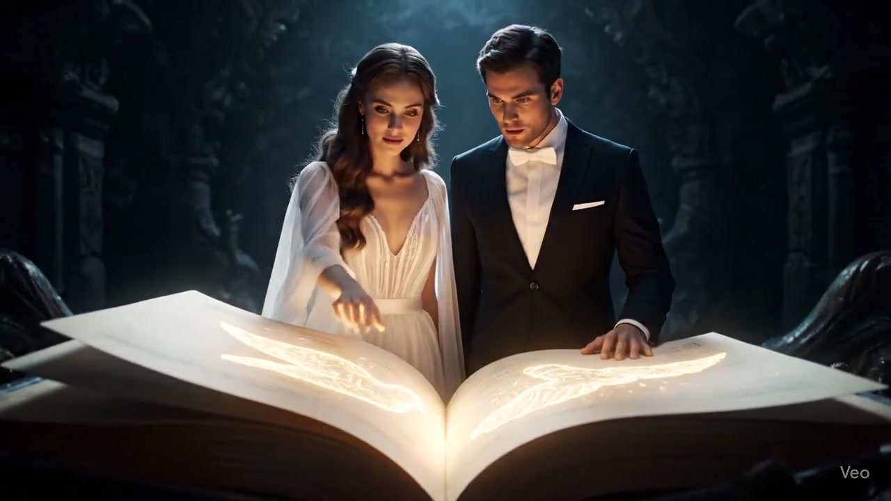"An 8-second, hyper-realistic, and magical cinematic sequence where a couple stands inside a giant, glowing book, and their interaction with the text brings a dove of light to life.",