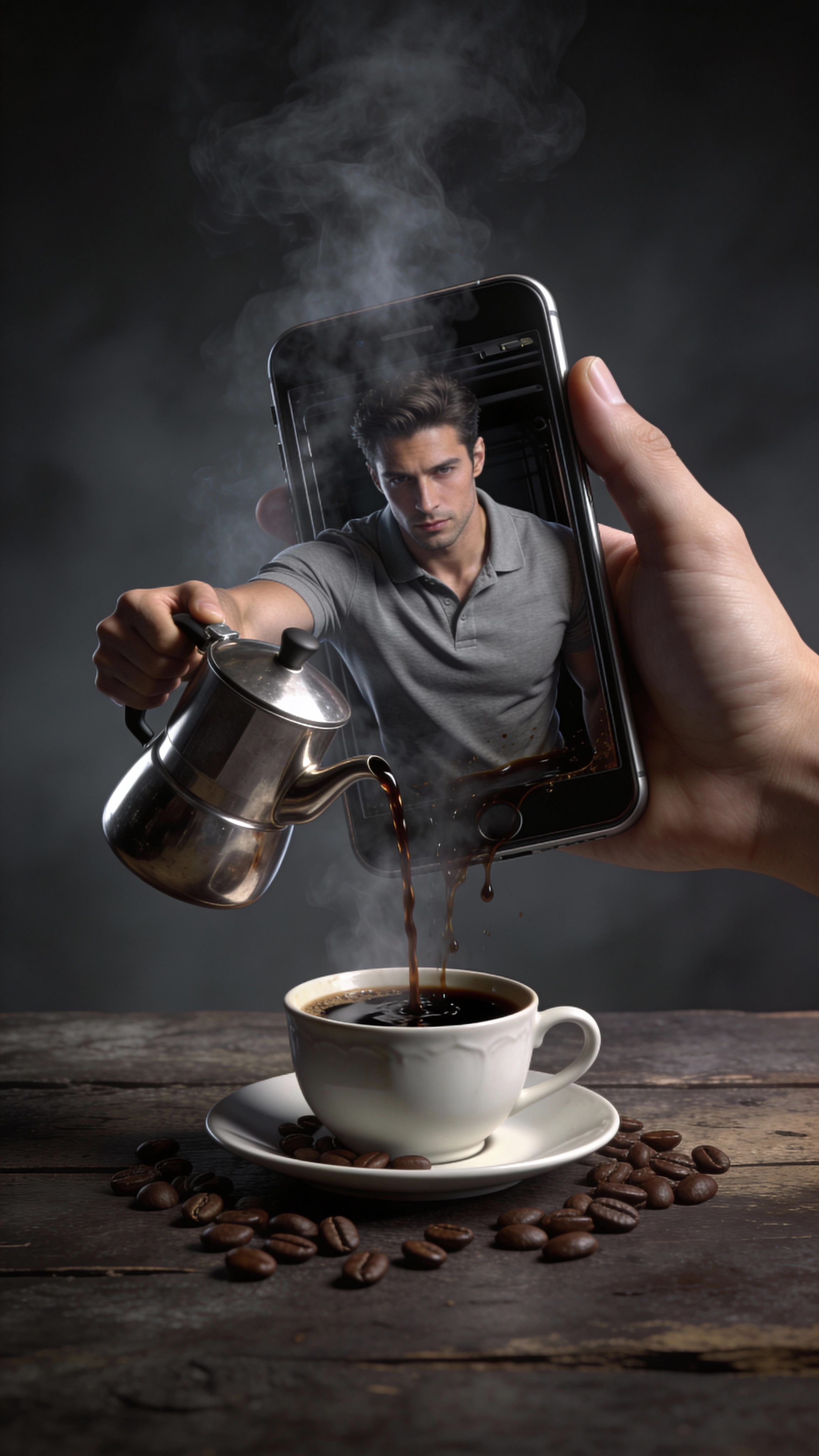 "A dramatic digital art image, surreal concept, of a seductive man using the downloaded photo, wearing a grey polo, emerging from a smartphone screen." He holds a stainless steel kettle and pours hot black coffee into a white porcelain cup resting on a saucer. Coffee leaks out of the screen, creating a surreal 3D effect. The scene is set on a rustic, dark wood table with coffee beans scattered around the cup. A large hand holds the smartphone, which appears to float in a dark, smokey, gray studio background. The lighting is dramatic and studio-quality,