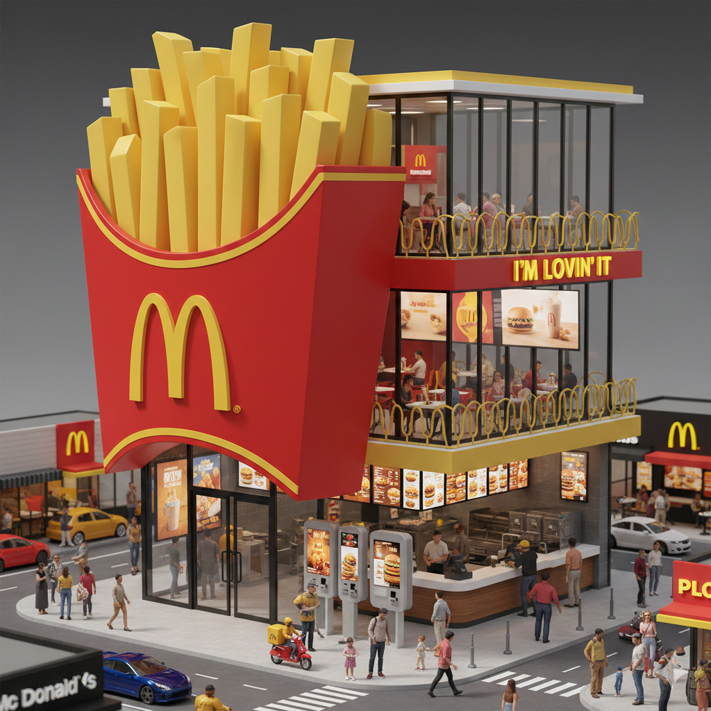 3D rendering, miniature architectural photography style, main structure is a colossal McDonald's branded french fries container building, featuring iconic red cardboard box with golden arches "M" logo and yellow accent stripes. Two-story building design: ground floor has glass entrance doors shaped like box opening, promotional display area, and counter service with families ordering meals inside. Interior shows abundant menu displays, self-order kiosks and food preparation areas. Second floor includes transparent windows and fries-shaped decorative rails on balcony with people enjoying burgers at dining tables. Surrounding urban environment shows fast food restaurants, diverse customers walking, and delivery drivers. Energetic and family-friendly atmosphere emphasizing I'm lovin' it, showcasing McDonald's iconic brand identity in global fast food sector. High-quality 3D rendering, detailed miniature style, vibrant commercial photography aesthetic