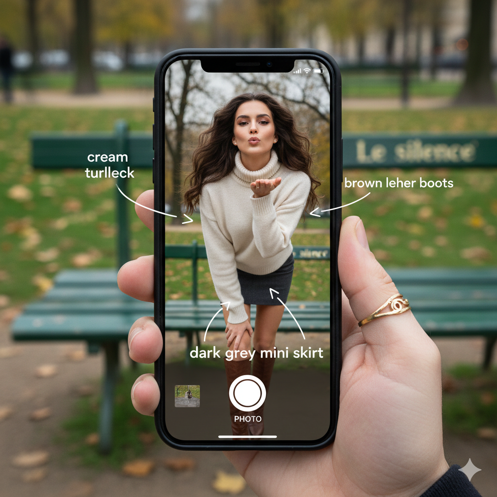 "prop": "On the phone screen: White handwritten-style text overlays with arrows pointing to the outfit elements (e.g., text 'suede jacket' with arrow, 'leather boots' with arrow)."