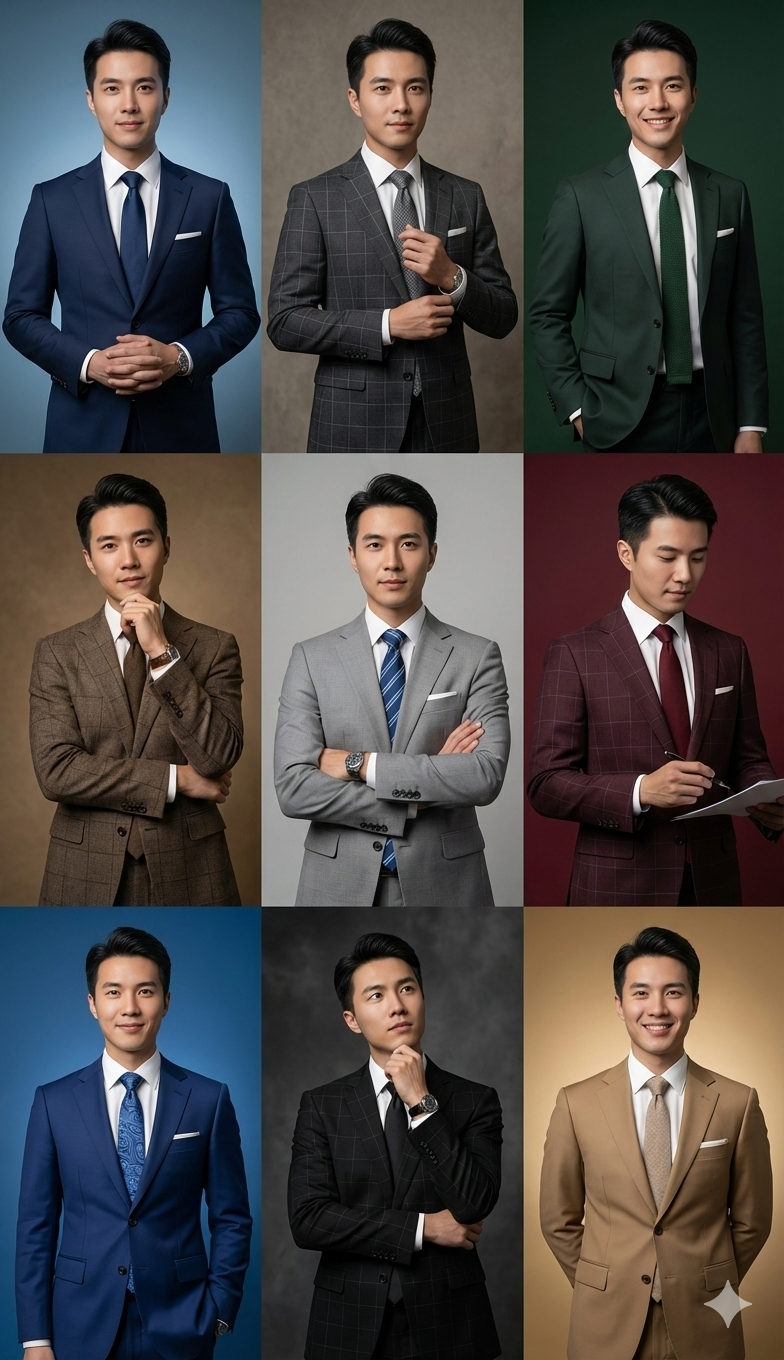 "Create 9 ultra-realistic 8K portraits of the same man using the uploaded photo exactly (100% identical facial identity). Arrange them in a 3x3 grid (portrait ratio) with each image showing him in a different color suit and tie (mix of solid and checked). Each scene should feature a unique pose, gesture, and background color tone."