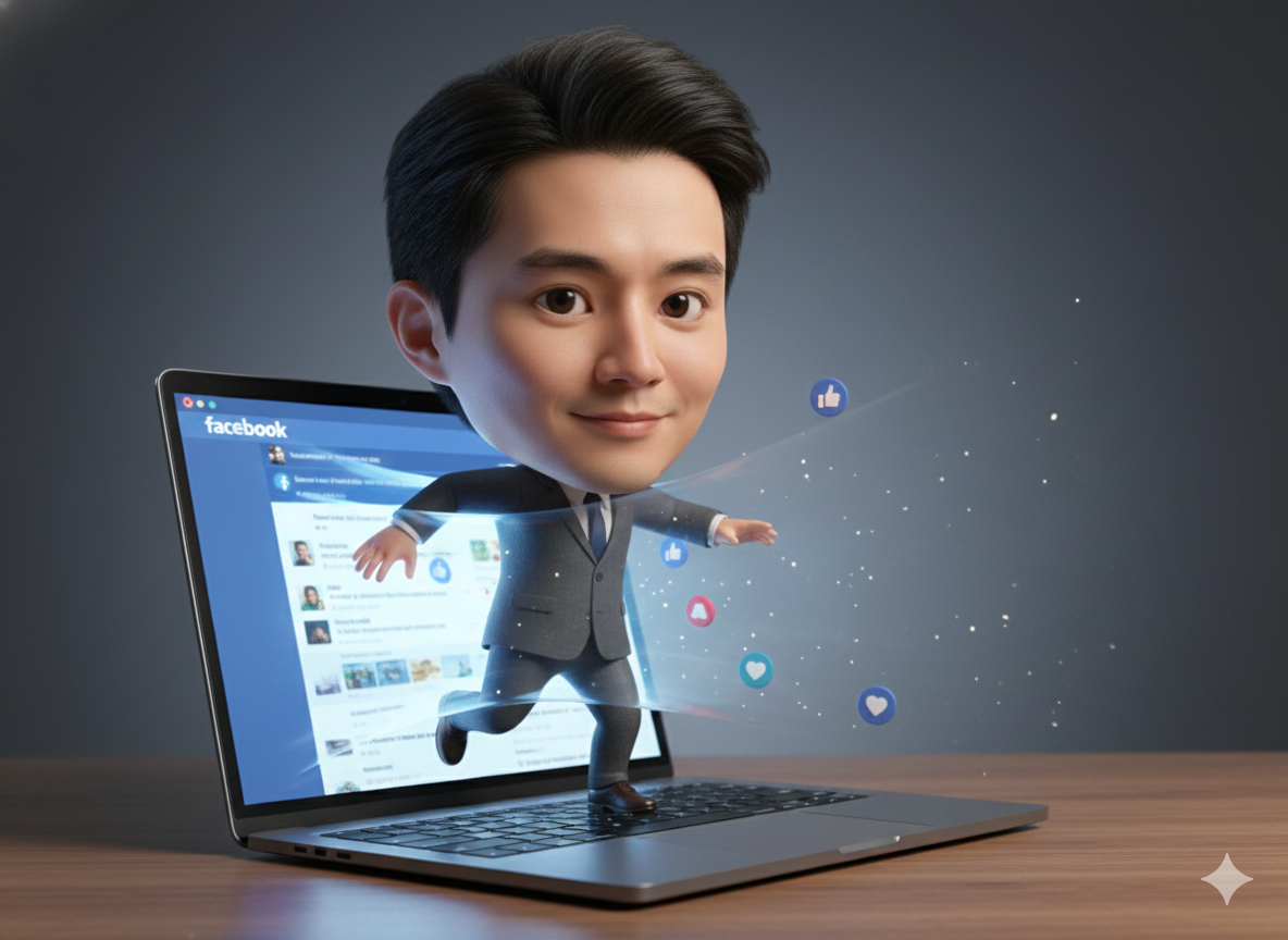 A modern laptop on a desk, realistic materials and reflections. The laptop screen displays a Facebook interface with a familiar blue colour palette and feed layout, slightly softened to fit the scene. The screen emits a soft glow.