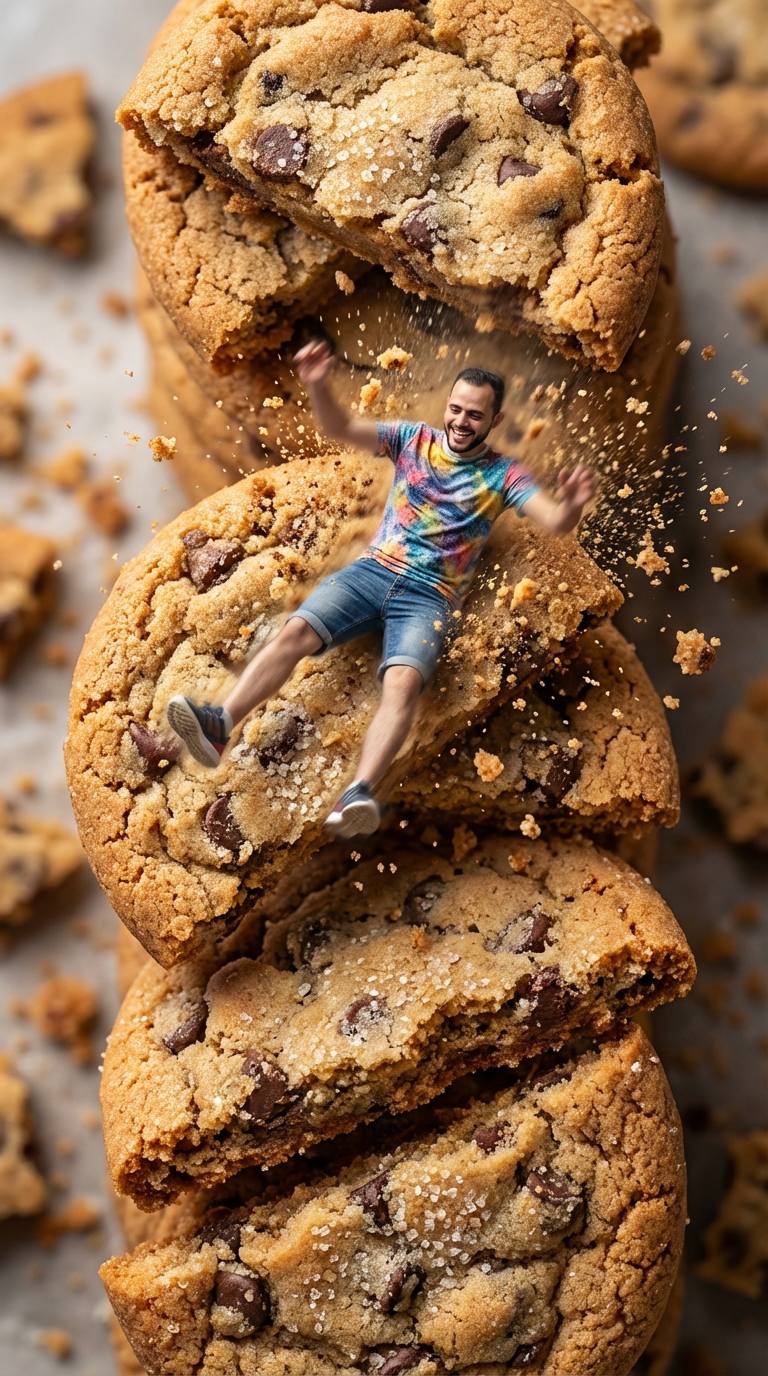 cookie crumbs flying, motion blur to emphasize speed,