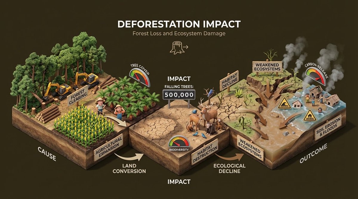 Textures look realistic and balanced. Lighting feels soft and clear. The raised base splits into cause, impact, and outcome sections. Include visual indicators like meters, symbols, or levels.