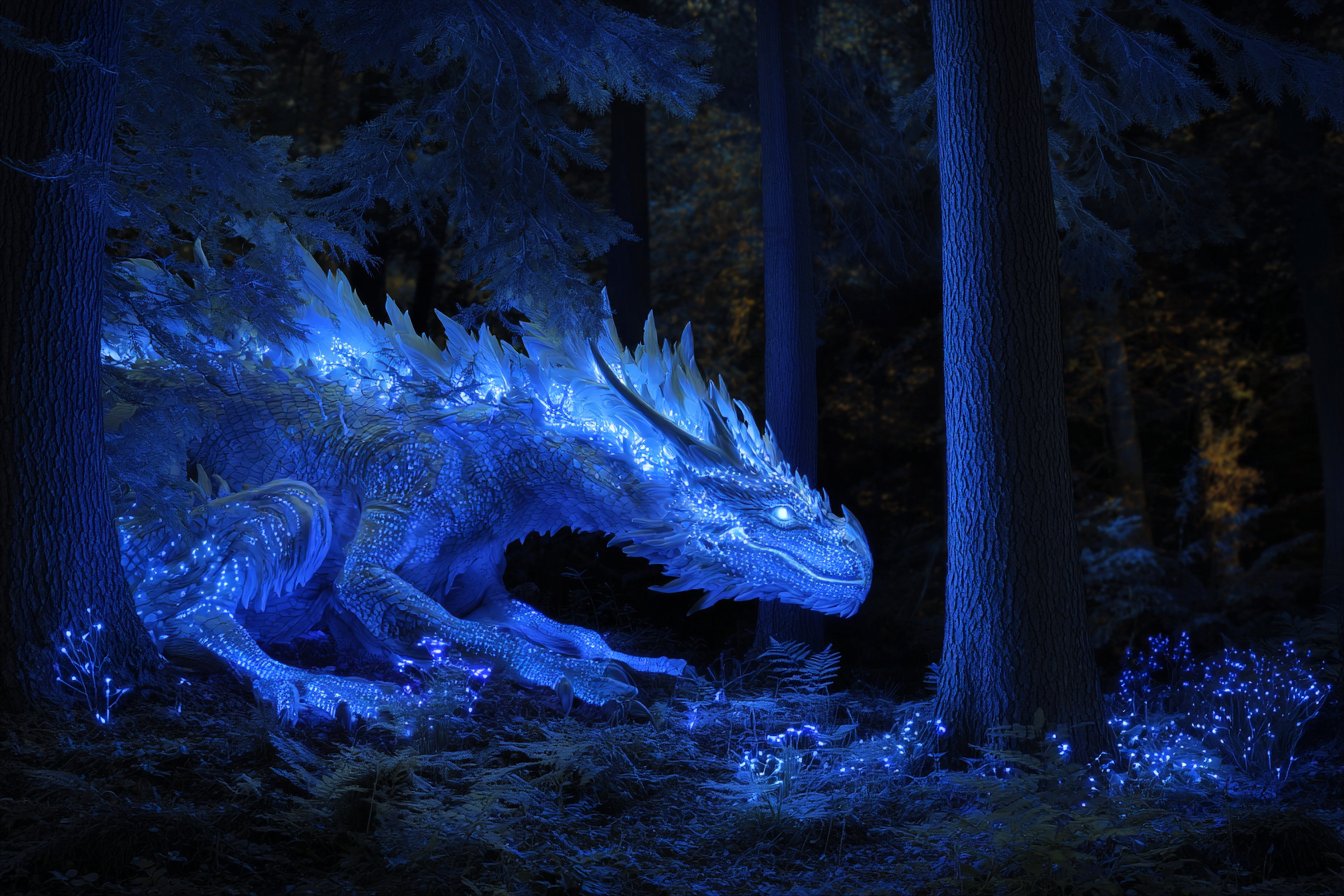 Ancient Dragon portrayed in a Bio-Luminescent Fairytale Forest, where glowing flora and fauna illuminate the night. Utilize cool, ethereal shades of sapphire blue and icy silver to create a magical and otherworldly atmosphere --ar 3:2