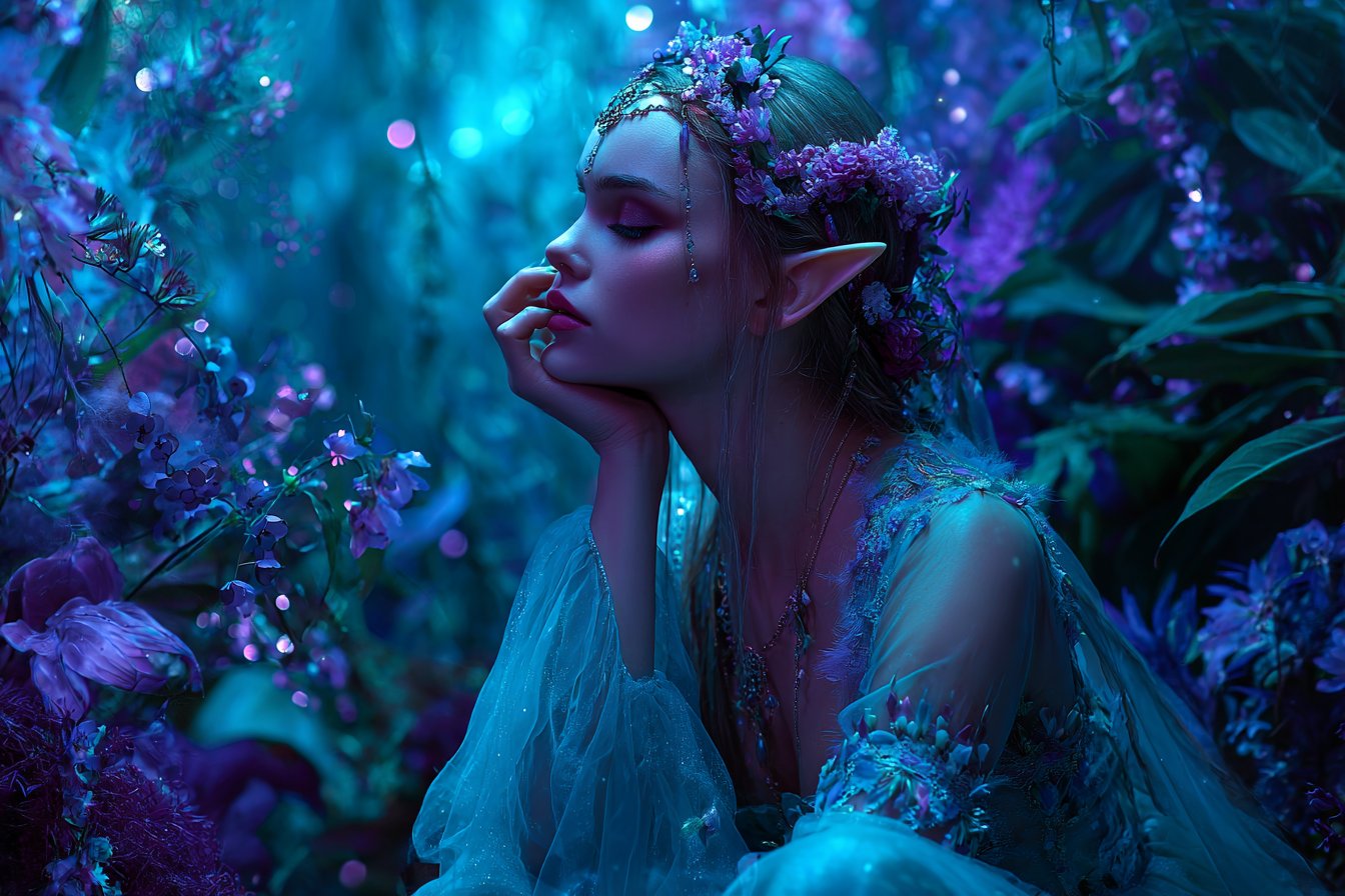 Ethereal Elf Princess portrayed in a Bio-Luminescent Fairytale Forest, where glowing flora and fauna illuminate the night. Utilize cool, ethereal shades of teal and lavender to create a magical and otherworldly atmosphere --ar 3:2