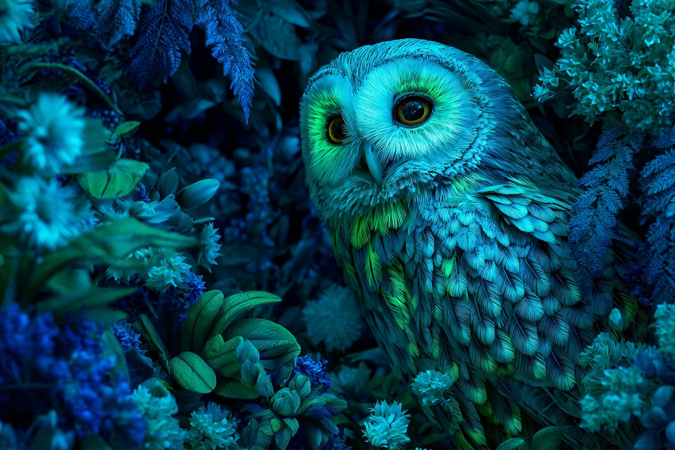 Enchanted Owl portrayed in a Bio-Luminescent Fairytale Forest, where glowing flora and fauna illuminate the night. Utilize cool, ethereal shades of emerald green and cerulean blue to create a magical and otherworldly atmosphere --ar 3:2