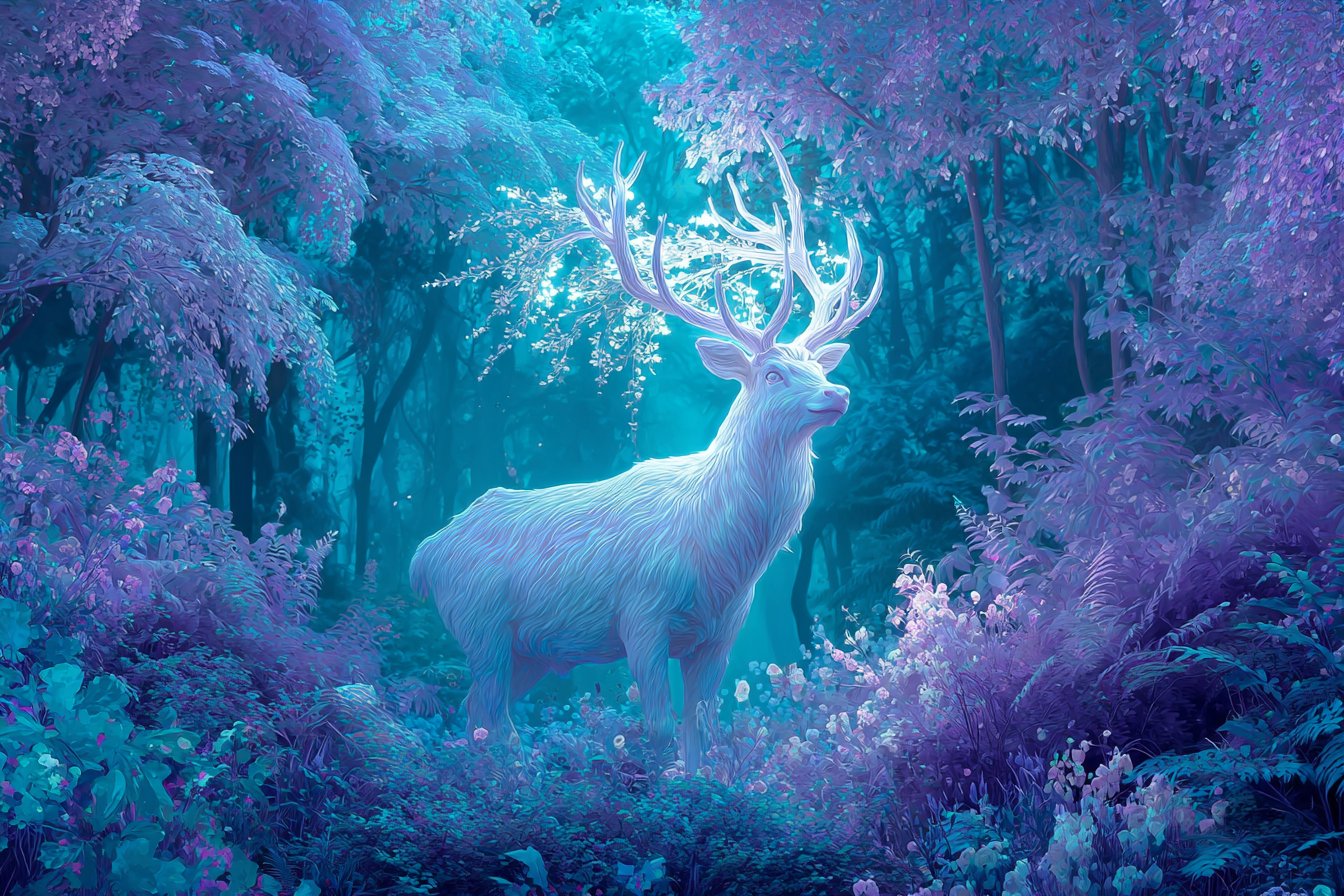 Majestic White Stag portrayed in a Bio-Luminescent Fairytale Forest, where glowing flora and fauna illuminate the night. Utilize cool, ethereal shades of teal and lavender to create a magical and otherworldly atmosphere --ar 3:2