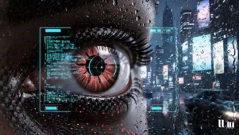 * **Color Palette:** Strictly adhere to a palette of deep blacks, shadowy grays, a dominant, aggressive red (from the eye's glow and select neon signs), and accent colors of electric blue and cyan (from the HUD and advertisements). The rain-slicked streets should reflect these colors vividly.