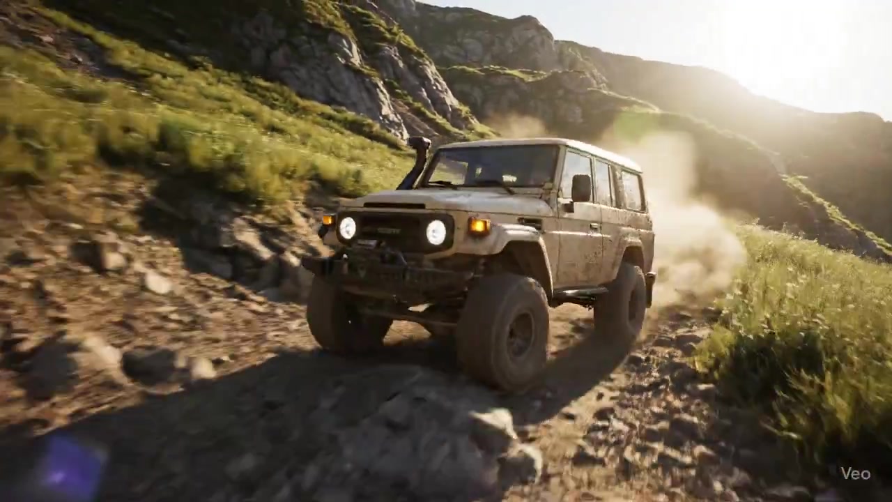 "A hyper-realistic, dynamic drone-chase shot of a rugged off-road SUV navigating a treacherous, sun-drenched mountain trail at high speed.", "mood": "Adventurous, thrilling, rugged, powerful, wild.", "style": "Cinematic automotive commercial, photorealistic CGI, 8K resolution, inspired by 'Top Gear' specials and overland expedition documentaries." }, "camera": { "type": "Dynamic Drone Chase Cam", "lens": "35mm Anamorphic Lens", "aperture": "f/8", "position": "Starts behind and slightly to the right of the lead SUV, flying low to the ground to exaggerate the sense of speed and terrain difficulty.", "movement": "The camera dynamically follows the SUV, occasionally dipping and weaving to avoid simulated obstacles. It vibrates slightly in response to the rough terrain and the downwash from its own 'rotors', adding to the realism." }, "environment": { "location": "A narrow, winding dirt and gravel trail cut into the side of a steep, grassy mountain. The landscape is a mix of exposed rock faces, patches of lush green grass, and small wildflowers.", "trail_surface": "Uneven and challenging, with loose gravel, embedded rocks, and patches of dry, dusty earth. Visible tire tracks are carved into the path.", "sky": "A bright, late morning sky with scattered, puffy white clouds and a brilliant sun creating a slight lens flare.", "atmosphere": "The air is clear and crisp. A significant, high-resolution particle simulation of dust and small gravel is kicked up by the SUV's tires, hanging in the sunlit air." }, "main_subject": { "vehicle": "A beige, heavily modified 4x4 expedition vehicle, similar to a classic Toyota Land Cruiser, based on the provided image.", "details": "The vehicle is equipped with a roof rack holding extra gear, a snorkel, large, knobby off-road tires, and powerful front spotlights. It is covered in a realistic layer of dust and dried mud splatters.", "secondary_vehicle": "A second, similar SUV is visible further back on the trail, partially obscured by the dust of the lead vehicle.", "material": "The vehicle's paint has a semi-gloss finish, with visible micro-scratches and chips from off-road use. The tires have a matte, dusty rubber texture." }, "lighting": { "primary_source": { "type": "Bright Mid-Morning Sun", "position": "High and to the right, casting sharp, defined shadows.", "fill_light": { "type": "Sky and Ground Bounce", "color": "Cool blue from the sky and warm earth tones from the ground.", "intensity": "Naturally fills in the shadows, preventing them from being completely black." } }, "animation": { "vehicle_dynamics": "A physically-based simulation of the vehicle's suspension, showing it realistically compressing and rebounding as it travels over rocks and uneven ground. The vehicle's body rolls and pitches in response to the turns and bumps.", "particle_simulation": "A detailed simulation of dust, dirt, and small rocks being thrown up by the tires. The dust should interact with the sunlight to create volumetric effects.", "audio_design": { "style": "Gritty, powerful, and immersive.", "sound": "The continuous, loud crunch and spray of gravel and dirt under the tires." }, { "time": "Throughout", "sound": "The rattle and creak of the vehicle's chassis and suspension as it flexes over the rough terrain."