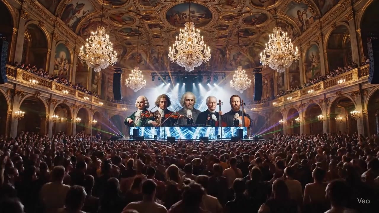 "visuals": "Hyperrealistic 8-second cinematic video. Grand Town Hall of Louis XVI transformed into the biggest rave in history. A massive ecstatic crowd, thousands headbanging in unison under strobe lights and lasers. On stage: classical music legends who strongly resemble Mozart, Beethoven, Bach, Tchaikovsky, and Chopin, performing alongside two superstar DJs who look identical to the world’s top EDM icons. Baroque chandeliers shake with the bass, futuristic DJ decks blend seamlessly with classical instruments. Extreme beauty, euphoric energy, cinematic lighting, ultra-HD detail, surreal yet photorealistic.",