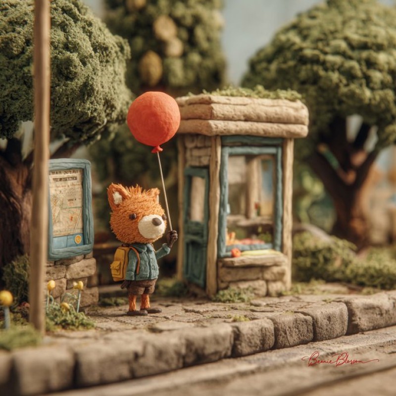 A tiny fox with a backpack waits at a toy-sized bus stop, holding a bright red balloon. The scene is crafted in clay, with chunky textures and soft, rounded shapes that feel handmade. Rendered in claymation stop-motion style with playful detail and warm, childlike charm.