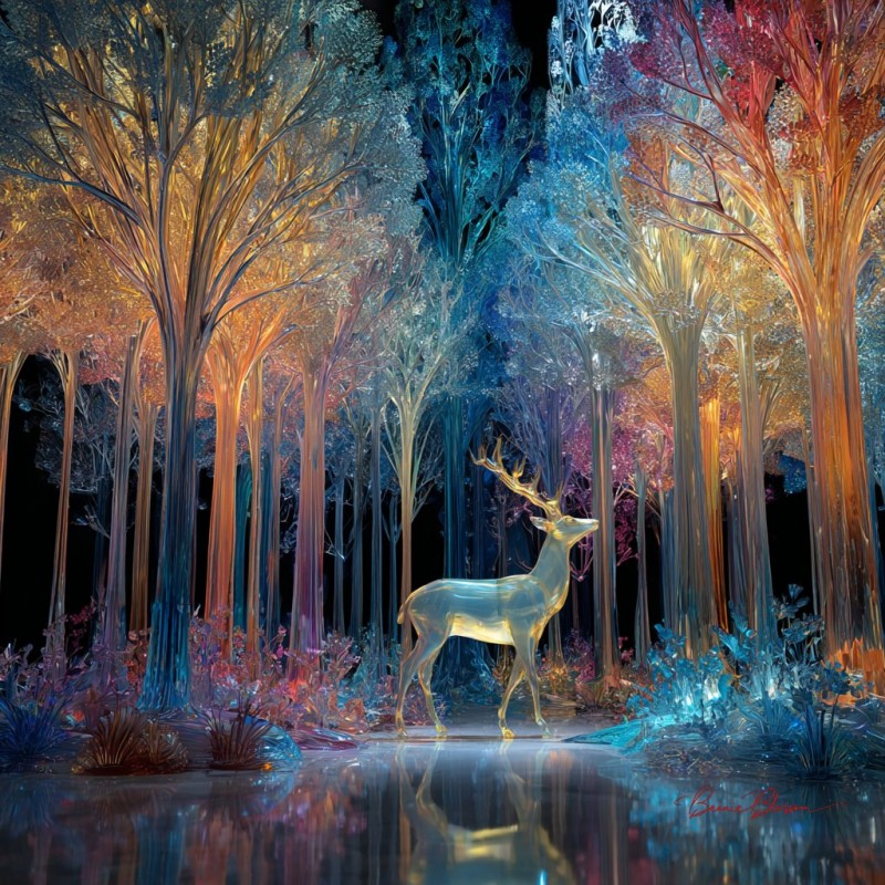 A forest clearing filled with towering trees sculpted entirely from glass, their branches refracting light into shimmering rainbows. A deer made of crystal stands among them, glowing in the dawn. Rendered in glass sculpture art style with luminous detail, high contrast, and an ethereal, breathtaking mood.