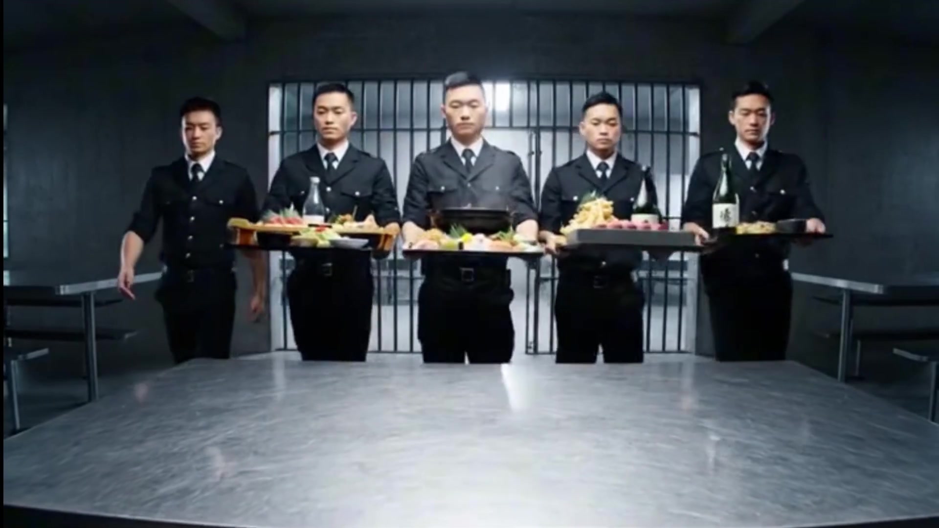 Ultra-wide-angle lens, a dim, minimalist gray concrete prison cafeteria. In the center of the room, a long, brushed stainless steel table reflects a cold light. Five prison guards in crisp black uniforms, with serious expressions, march in unison from behind a barred gate in the background. Each carries a huge tray laden with a luxurious Japanese feast. The camera slowly pushes in and pans, capturing the moment the guards exquisitely arrange the dishes. The dishes include: a massive sushi boat filled with assorted premium sashimi and sushi; a steaming pot of Sukiyaki; a mountain of Tempura; sizzling Kobe beef on a stone slab; several bowls of meticulously prepared Kaiseki appetizers; vibrant Japanese salads and pickles; and several chilled bottles of Junmai Daiginjo sake. The lighting is dramatic, with high-contrast illumination, creating a strong visual impact between the vibrant colors of the food and the bleak prison background, reminiscent of a high-end food commercial. Steam rising from the hot dishes is clearly visible. The video concludes with a stunning static panorama; the entire impossibly lavish feast is perfectly arranged on the table, with the guards standing solemnly behind it. The sound design is extremely minimalist, with the only source being a soft, close-mic ASMR female whisper, clearly saying: "Japanese food."