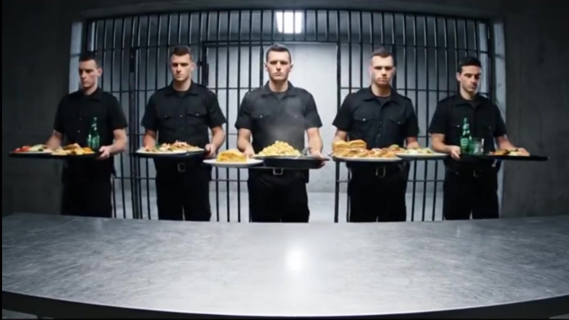 The lighting is dramatic, with high-contrast illumination, creating a strong visual impact between the vibrant colors of the food and the bleak prison background, reminiscent of a high-end food commercial. Steam rising from the hot dishes is clearly visible.