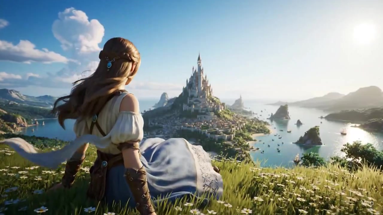“A hyper-realistic, epic wide shot from over the shoulder of a young woman as she sits on a grassy cliff, looking out at a magnificent island kingdom under a bright, clear sky.”,