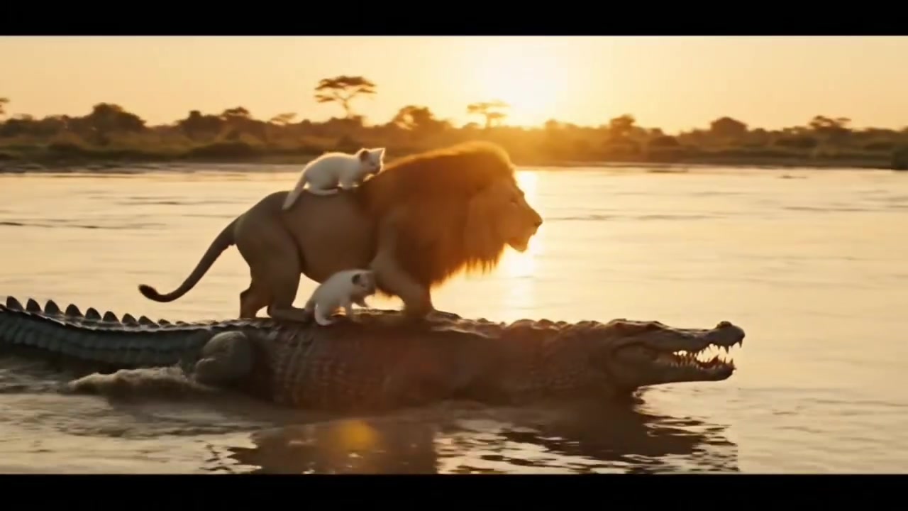 > "A high-resolution smartphone camera, handheld with natural shakiness, filming from about 50 meters away as if by a surprised bystander. In the African savanna at sunset, a large crocodile crosses a wide muddy river carrying a majestic lion and a small fluffy white kitten on its back. The camera operator zooms in quickly in amazement. As the lion reaches the riverbank, it leaps powerfully onto the grassy cliff. Realistic golden lighting, natural motion, slight blur from handheld movement, with splashes of water visible. The scene feels spontaneous and unexpected, capturing the awe and disbelief of the cameraman—like someone exclaims, 'Eh… biar betul!'"