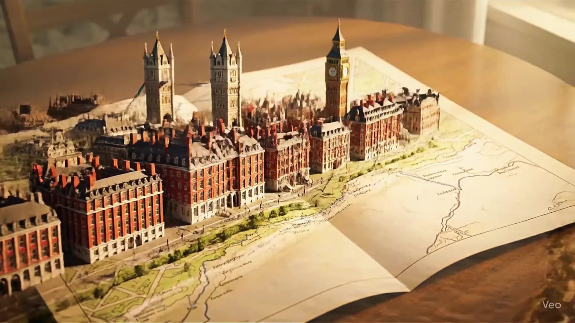 Create a Miniature Landscape-style Animation of London's Urban Growth. Starting with an unfolded map scene of London where the map texture is clearly visible, then groups of classic British buildings-featuring red brick structures, white window frames, and iconic landmarks like the Tower Bridge and Big Ben-emerge gradually from their corresponding map positions as if growing naturally, slowly forming the complete architectural skyline, followed by the Thames River taking shape and flowing along its course outlined on the map with traditional rowboats appearing on the surface, while oak trees and manicured hedges along the riverbanks grow sequentially following the green areas on the map, and the distant silhouette of St. Paul's Cathedral spreads softly like a watercolor wash in the background, finally the bold 3D text "LONDON" grows and forms from the area near the Thames on the map, throughout the process simulating the dynamic rhythm of a natural growth to create a 3D-rendered miniature model textured video embodying a elegant, historical British style, showcasing the wonderful transformation from a 2D map to a 3D city.