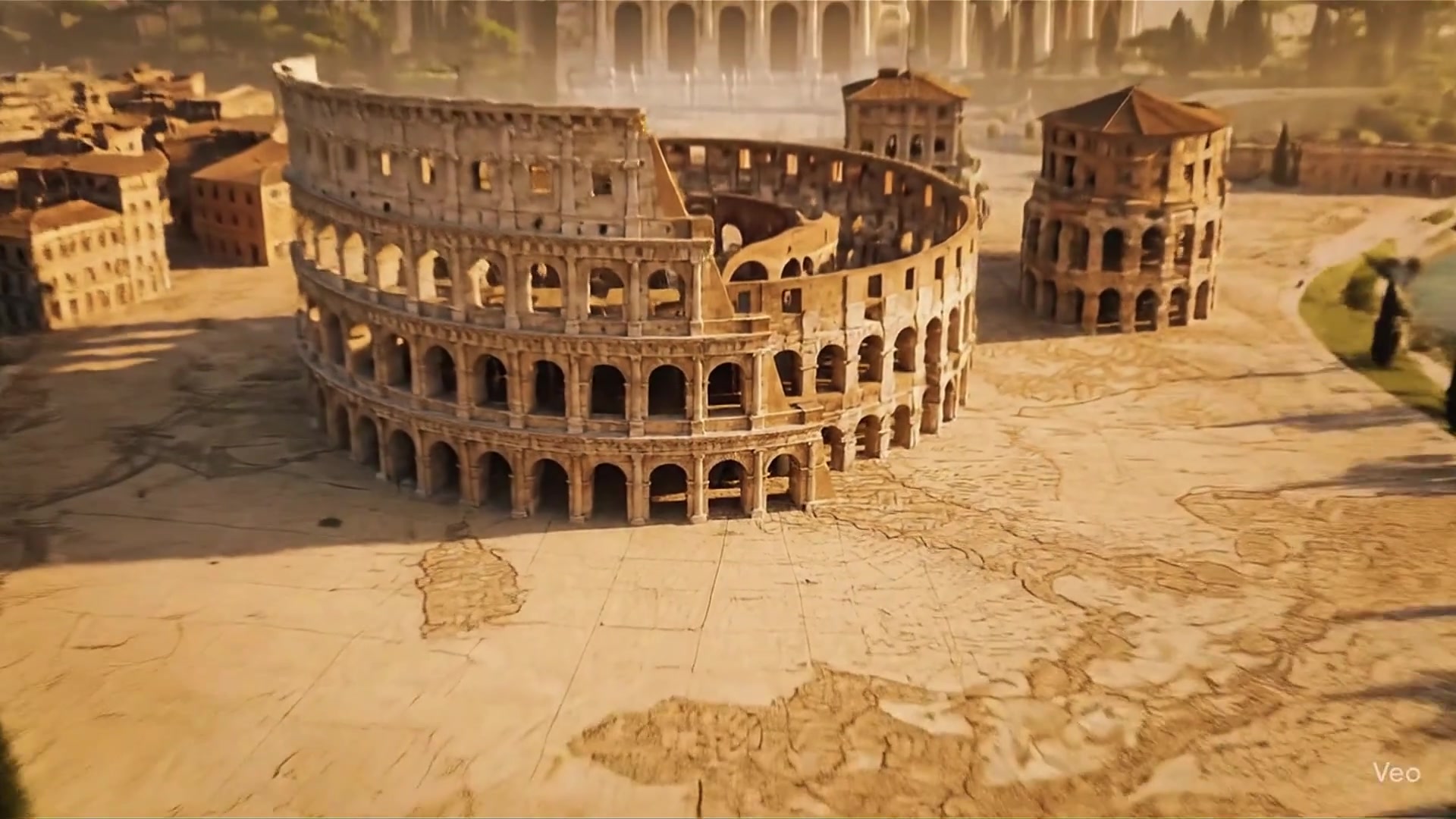 Create a Miniature Landscape-style Animation of Rome's Urban Growth. Start with an unfolded map scene of Rome where the map texture is clearly visible, then groups of classic Italian ancient buildings-characterized by stone arches, rectified roofs, and accompanied by the iconic Colosseum-emerge one by one from their corresponding positions on the map like the growth of all things, gradually forming the complete main structure of the buildings. Next, the Tiber River slowly takes shape and flows along the river course outline on the map, with vintage gondola-style boats appear-ing on the water surface. Olive trees and cypresses along the riverbank grow in sequence following the green space texture on the map, while the hazy view of the Pantheon in the background spreads simultaneously like an ink wash. Finally, the prominent 3D text "ROMA" grows and takes shape from the area beside the Colosseum on the map. Throughout the process, it simulates the dynamic rhythm of natural growth, creating a 3D-rendered miniature model textured video that embodies a classical, profound, and rich Italian style, showcasing the wonderful construction process from a 2D map to a3D city.
