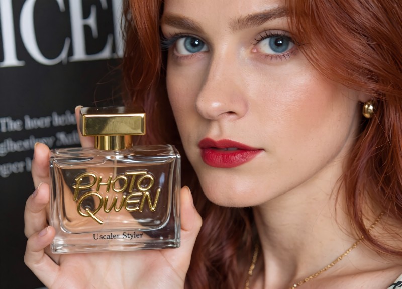 The perfume bottle, held in her hand, is clear with a gold cap. The label on the bottle reads "PHOTO QWEN" in a large stylish, 3d, golden, cursive font, and "Uscaler Styler," in a smaller serif font . The background is partially visible, showing a black surface with white text, adding depth to the image. The lighting is soft and flattering, highlighting her features and the details of the perfume bottle.