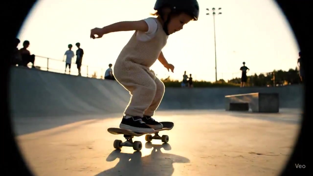 "position": "Starts very low to the ground, focusing on the skateboard's wheels, then smoothly arcs upwards and orbits around the toddler.","movement": "A smooth, stabilized orbital shot on a gimbal, moving from a low angle to eye-level over the 8 seconds, emphasizing the subject's small size and impressive balance."