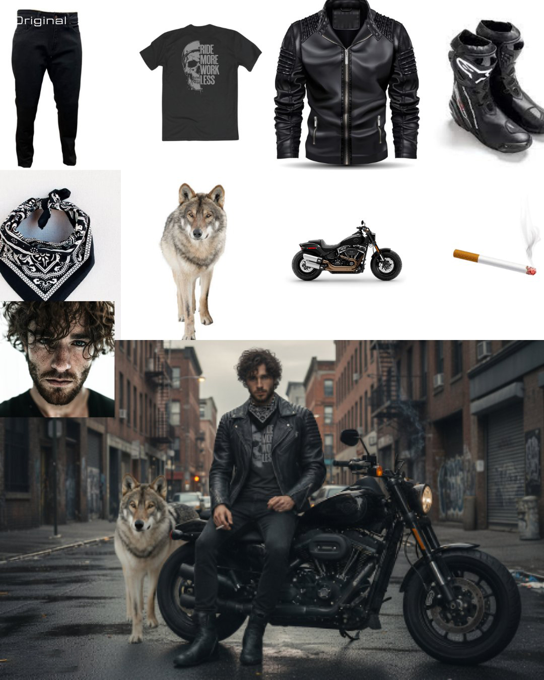 The man from the first image is leaning against his motorbike, as shown in the second image, wearing the outfit from the second image. He is smoking a cigarette, with a large wolf standing beside him, both displaying intense expressions. The background is an urban street scene, adding a gritty atmosphere.