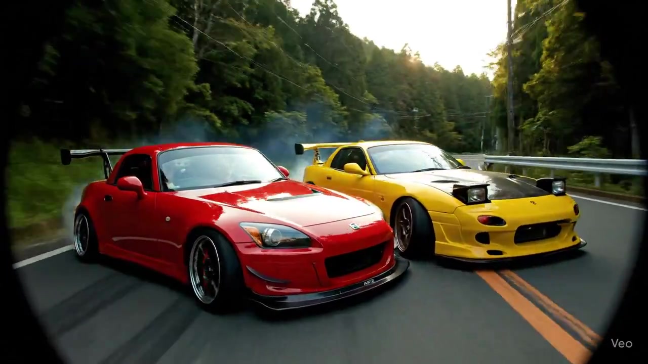 "A hyper-realistic, dynamic tracking shot of two heavily modified Japanese sports cars—a red Honda S2000 and a yellow Mazda RX-7—drifting in tandem through a tight corner on a mountain pass.", "mood": "Intense, exhilarating, competitive, focused, stylish.", "style": "Cinematic realism with an anime-inspired aesthetic, photorealistic CGI, 8K resolution, capturing the high-energy feel of 'Initial D' and professional drift footage." }, "camera": { "type": "Low-Angle Drone Chase", "lens": "35mm Anamorphic Lens", "aperture": "f/2.8", "position": "Starts low to the ground behind the yellow RX-7, then swoops to the side to capture both cars side-by-side as they enter the drift.", "movement": "A smooth, high-speed, and aggressive drone shot that keeps pace with the cars, panning and tilting to follow their drift lines and capture the proximity between them." }, "environment": { "location": "A narrow, two-lane asphalt road winding through a dense, lush green forest on a Japanese mountain (touge).", "details": "Tall, dense trees line the road, creating a canopy that dapples the scene with sunlight. The asphalt is dark and shows signs of wear, with visible tire marks from previous runs. A yellow dividing line marks the center of the road.", "sky": "A bright, late afternoon sky with a few soft, white clouds visible through the trees.", "atmosphere": "The air is filled with thick, white tire smoke billowing from the rear wheels of both cars. A high-resolution particle simulation shows small leaves and road debris being kicked up by the cars." }, "lighting": { "primary_source": { "type": "Late Afternoon Sun", "position": "Low in the sky, filtering through the trees, creating dramatic shafts of golden light and long shadows.", "color_temperature": "4500K (Warm, golden light)", "intensity": "Bright, creating brilliant highlights on the cars' bodywork." }, "fill_light": { "type": "Bounce light from foliage and road", "color": "Lush greens and neutral greys.", "intensity": "Softly illuminates the cars, ensuring details in the shadows are visible." }, "effects": "Prominent anamorphic lens flares as the camera catches the sun through the trees. Strong motion blur on the background and road surface." }, "main_subjects": { "car_1": { "model": "A heavily modified, track-spec, red Honda S2000 (AP2).", "details": "Fitted with a large carbon fiber rear wing, a vented front bumper, wide-body fenders, and black multi-spoke racing wheels. The driver, an anime-style character, is visible through the window, focused and counter-steering.", "condition": "The car is pristine but shows signs of hard driving, like glowing brake rotors visible through the wheels." }, "car_2": { "model": "A heavily modified, iconic yellow Mazda RX-7 (FD3S).", "details": "Features a prominent carbon fiber hood, pop-up headlights (in the up position), a massive rear wing, and bronze-colored, deep-dish wheels. The driver, also an anime-style character, has an intense, competitive expression.", "condition": "Equally pristine, with visible heat haze shimmering from the exhaust." } }, "animation": { "car_movement": "Both cars are in a state of controlled, high-speed drift. Their rear ends are kicked out, and the front wheels are angled in the opposite direction of the turn. The cars are incredibly close, almost touching, as they navigate the corner in perfect synchronization.", "environment_interaction": "The tires realistically deform under the stress of the drift. The tire smoke is a complex, turbulent fluid simulation that hugs the ground before being dispersed by the cars' movement.", "subtle_details": "The drivers' hands move quickly and precisely on the steering wheels. The car bodies show realistic suspension travel, compressing and rebounding as they hit small imperfections in the road." }, "audio_design": { "style": "Loud, aggressive, and immersive, with a focus on mechanical sounds.", "sound": "The high-pitched, screaming roar of the S2000's VTEC engine at the redline, mixed with the unique, buzzing rasp of the RX-7's rotary engine." "sound": "An upbeat, high-energy Eurobeat track begins to fade in, adding to the classic touge racing atmosphere."