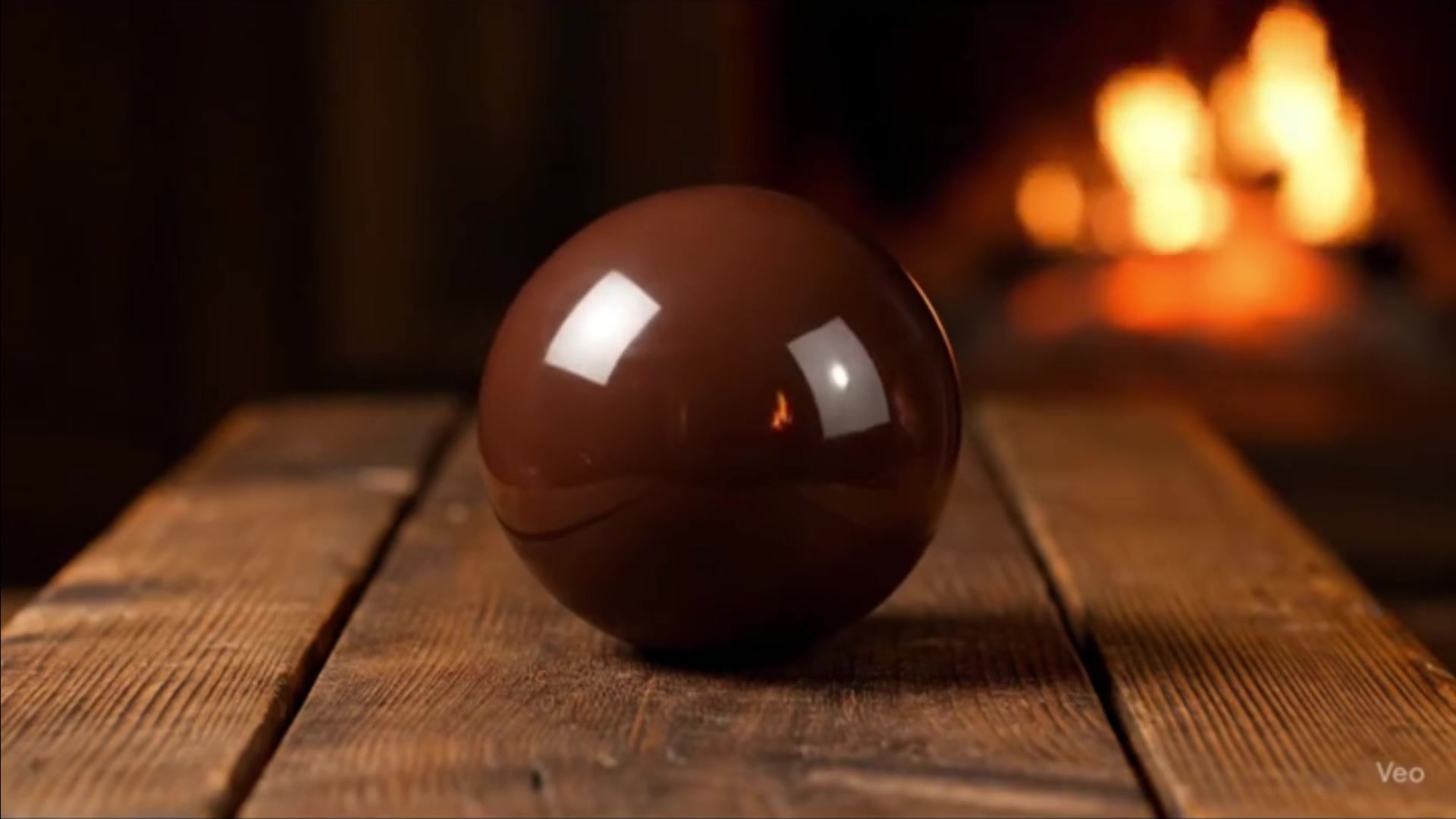 A hyper-realistic, cinematic shot, 4K, in the style of the reference video. A large, flawless sphere of dark chocolate with a perfect satin finish sits on a heavy wooden workbench. The roaring fire in the background reflects beautifully on its smooth surface. Suddenly, a hammer smashes the chocolate sphere in extreme slow-motion. The hard chocolate shell shatters into glossy shards, revealing its hollow core was filled with a vibrant mix of fresh, whole strawberries, raspberries, and a large dollop of thick white cream.
