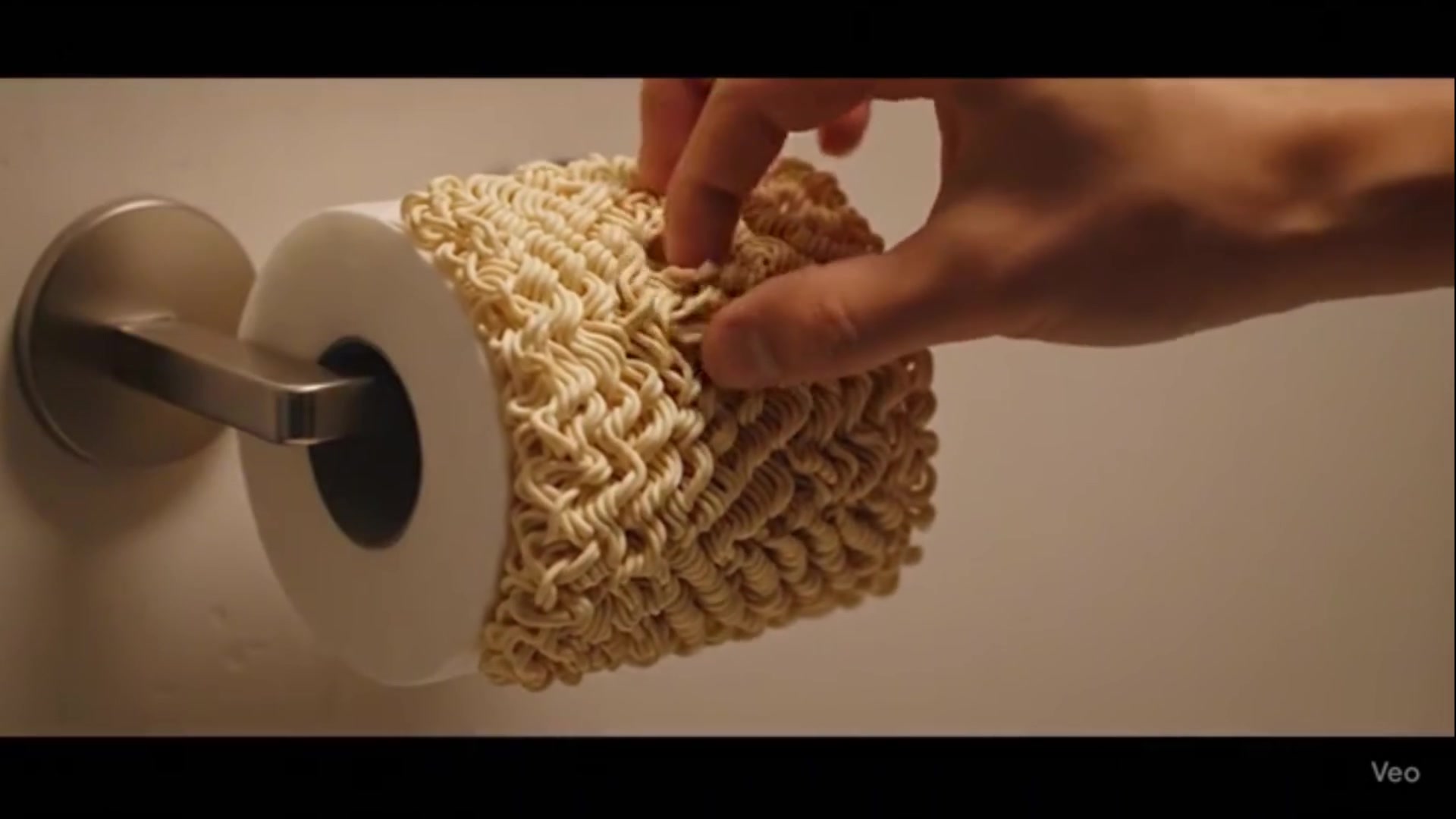 An ultra-photorealistic, 8K cinematic montage video, presented as a "Which one would you choose?" scenario. Each scene features a toilet paper roll on a simple holder, but reimagined with a different, impossible, and surreal material. The visuals are enhanced with hyper-realistic textures and satisfying ASMR sound design. The sequence of surreal toilet papers includes: Water: A roll where the paper is a sheet of perfectly clear, flowing water. A hand pulls it, and it stretches and drips like a viscous liquid under cool, moody blue lighting. Ramen: A perfect, solid block of dry, uncooked ramen noodles, expertly shaped into a toilet paper roll. A hand pulls on a single strand, and a long, continuous noodle unravels from the block with a satisfyingly crisp sound.