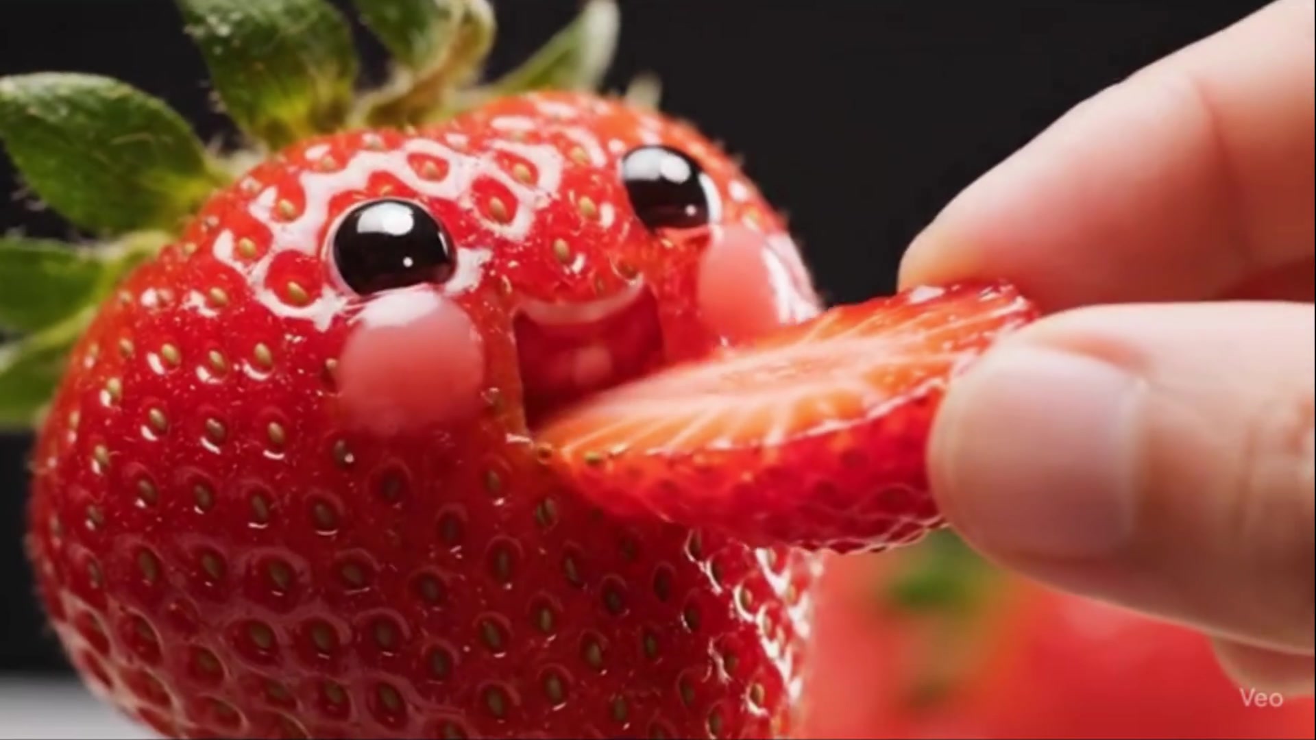 The video then transitions to a similar extreme macro shot. The subject is now a vibrant, ripe, red strawberry with a green calyx on top. It has the same cute anthropomorphic face with shiny, happy eyes. The same human hand feeds the strawberry a thin, juicy slice of another strawberry. The strawberry character chews enthusiastically, its cheeks puffing out significantly. Juice and realistic pulp are visible around its mouth. The lighting highlights the glossy texture of the strawberry's skin and its individual seeds. A large, syrupy droplet of juice drips down its chin. The style remains hyperrealistic with cinematic lighting and a shallow depth of field. The overall feeling is whimsical, charming, and satisfyingly cute.