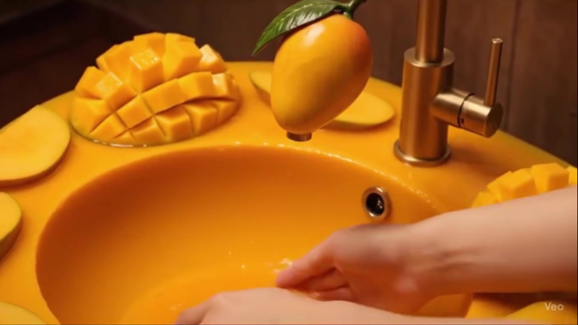 An ultra-photorealistic, 8K cinematic video, presented in the style of a surreal and luxurious product demonstration. The scene is a close-up on a bizarre and beautiful sink, masterfully sculpted to look exactly like a giant, hollowed-out, ripe mango. The sink basin has the vibrant, warm yellow-orange hue and smooth, matte texture of mango flesh. The faucet itself is designed to resemble a smaller, perfect mango, complete with a stem and a single leaf, attached to a brushed gold fixture. The sink is adorned with slices and perfectly cross-hatched cubes of real mango. A pair of hands enters the frame and turns the mango-shaped faucet handle. Instead of water, a stream of thick, luscious, and pulpy mango juice flows from the tap. As the person cups their hands to catch the flow, a cascade of fresh, perfectly diced mango cubes simultaneously tumbles down with the juice, rubbing the juice and the soft mango cubes together in a satisfying "wash," gently lighting is warm and intimate, with a shallow depth of field that keeps the focus entirely on this surreal act. The overall tone is a whimsical, sensory-rich experience that is both bizarre and deeply satisfying