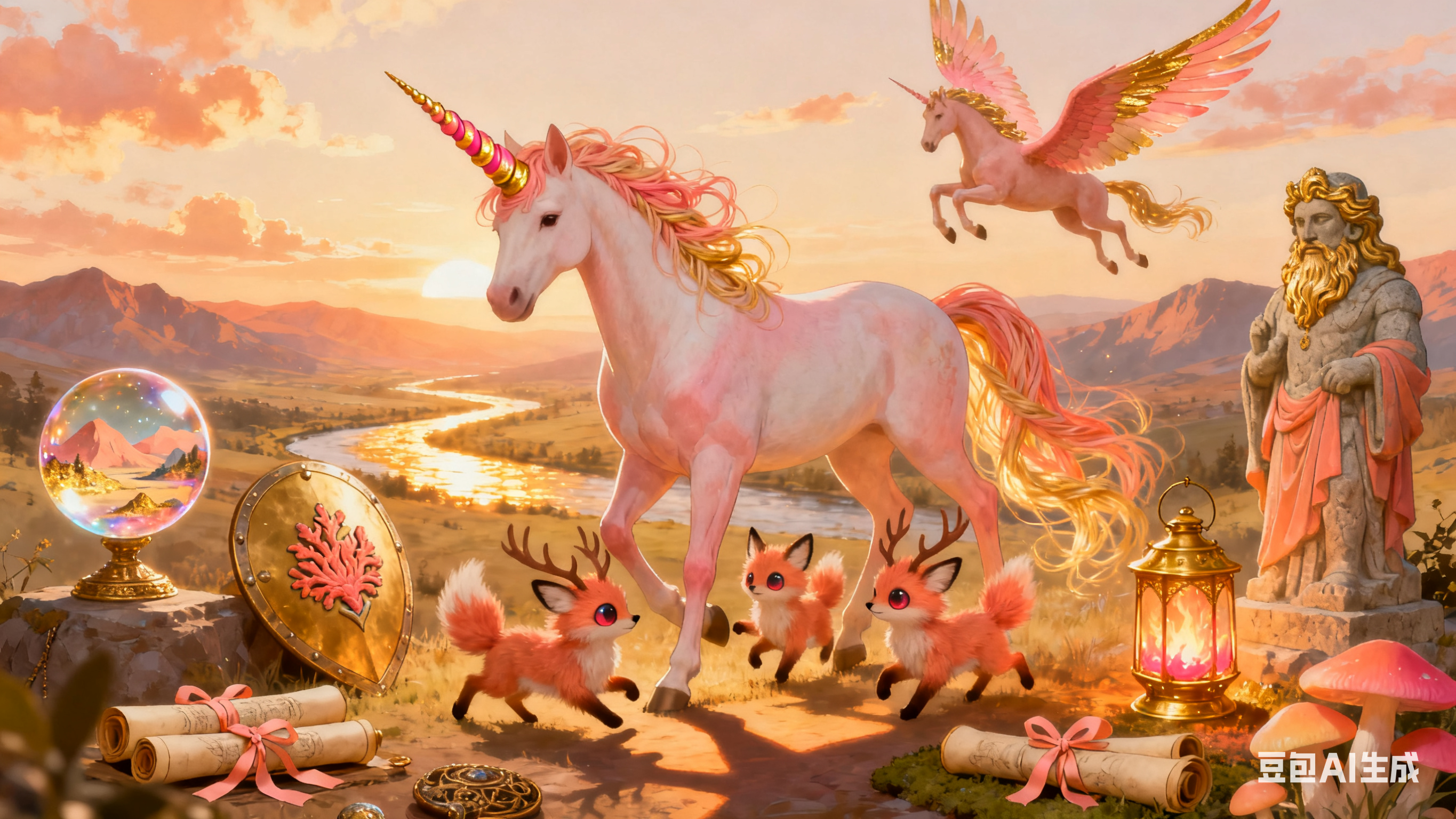 Unicorn illustrated in a Golden Hour Mythic Menagerie, where mythical creatures, ancient artifacts, and mystical objects gather in a warm, golden light. Use a color scheme of warm, sun-kissed peach and coral to evoke a sense of wonder and magic