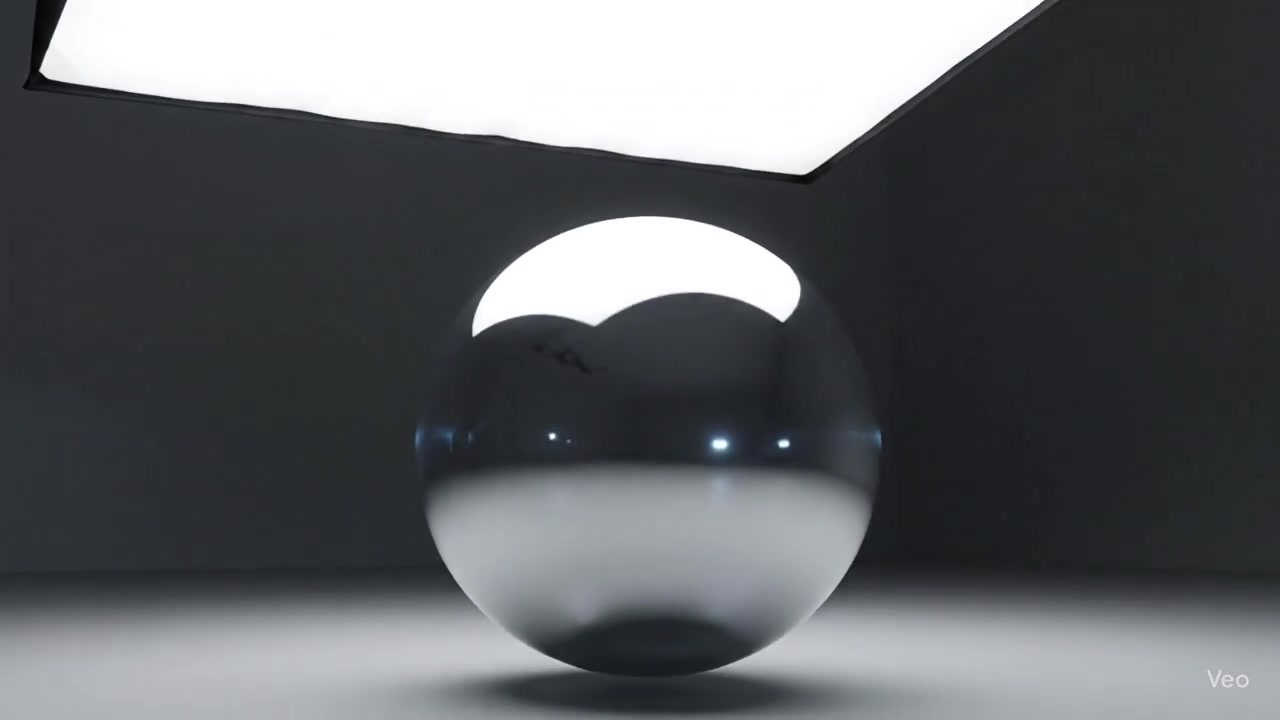 "description": "A single, perfect sphere of hyper-realistic, mercury-like liquid metal, hovering a few feet above the reflective floor.",