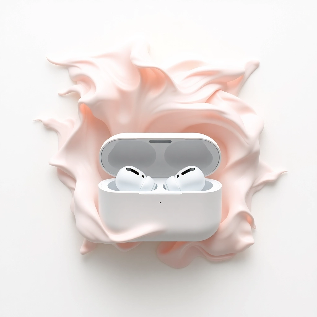 Wireless earbuds and case emerging from a fluid paint cloud (white + pastels), subtle light-strip sound waves; smooth plastics, controlled micro-speculars, clean background